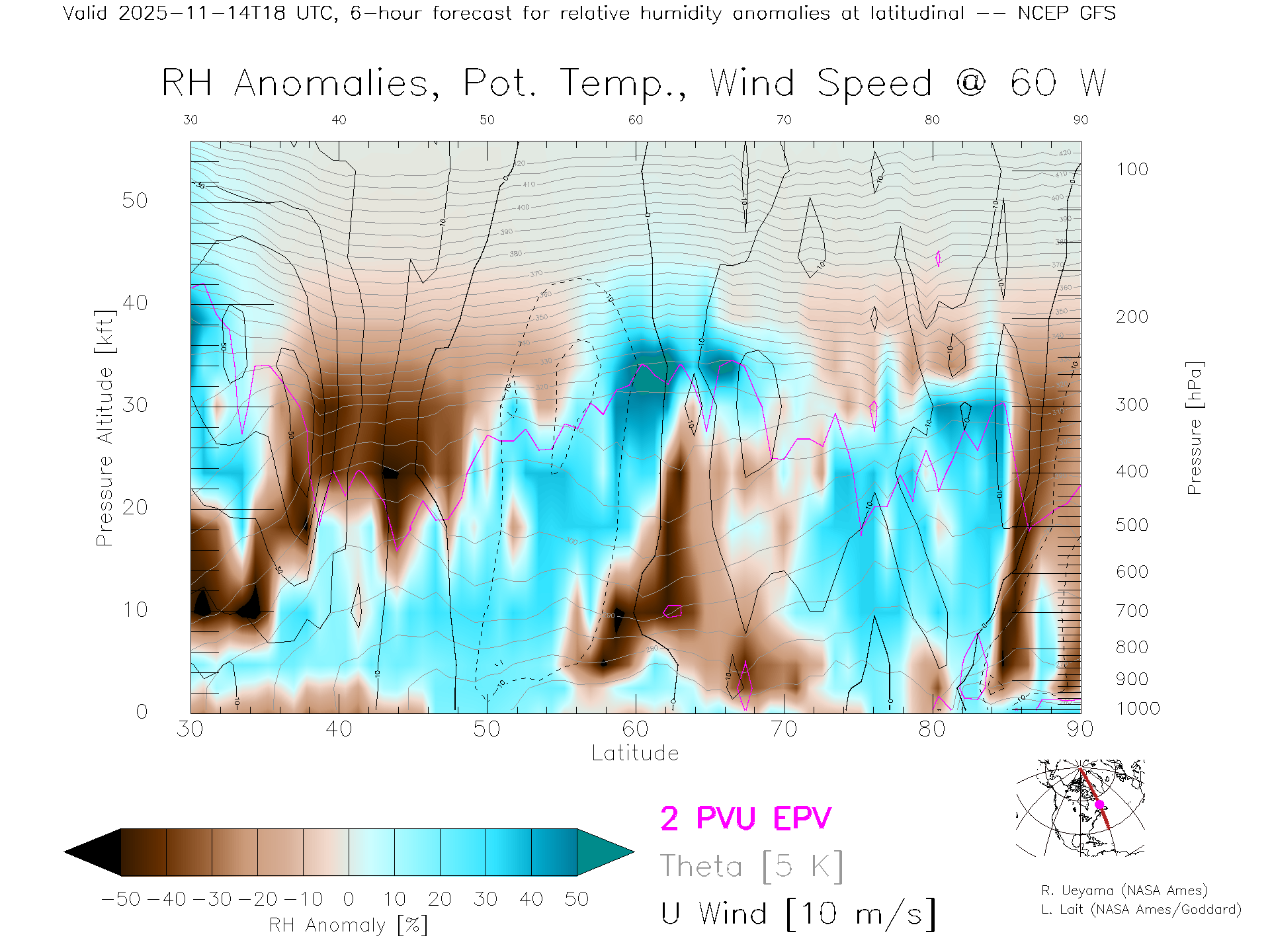 NCEP GFS Forecast Rel. Hum. X-Section (60 W)
