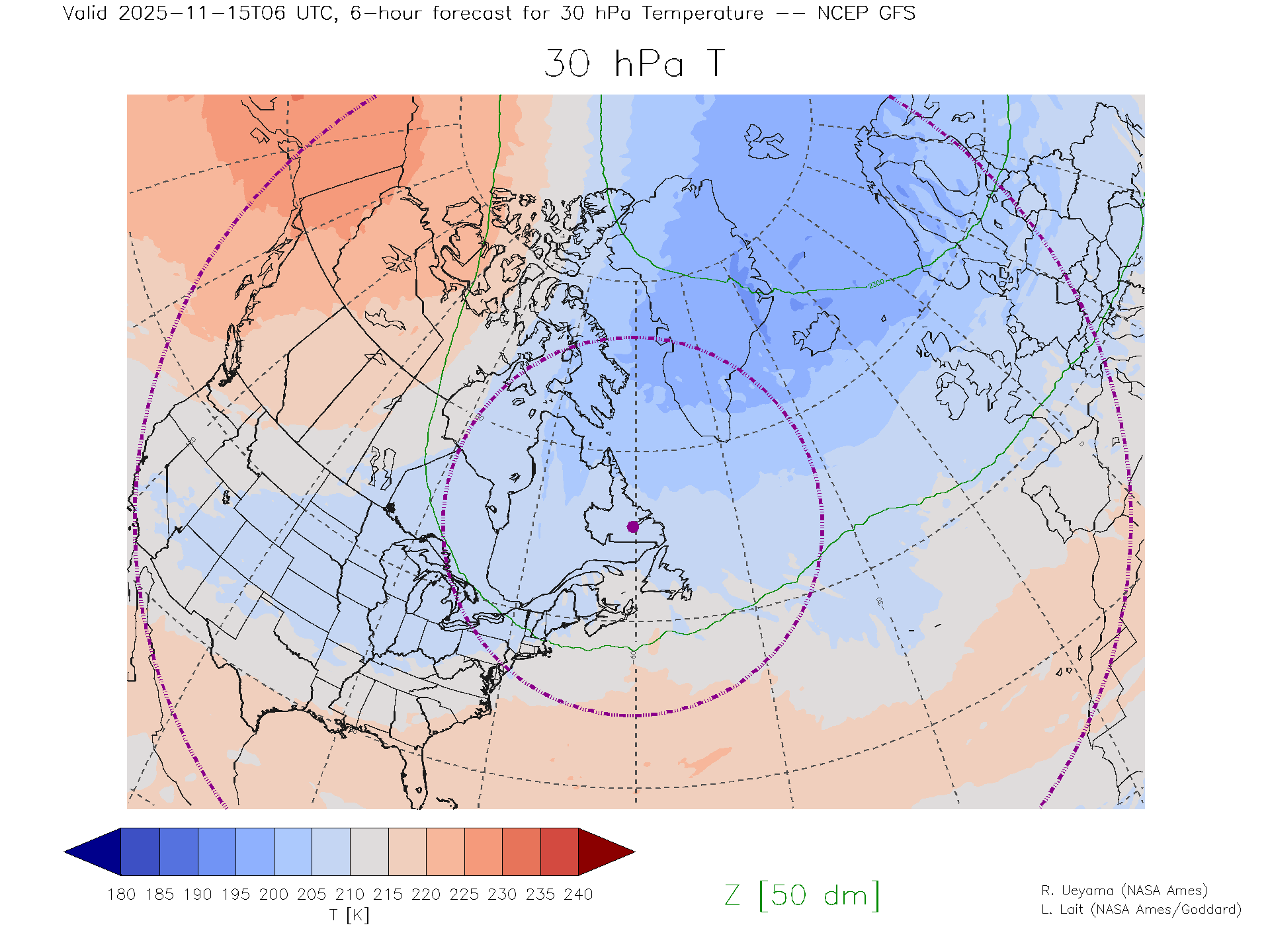NCEP GFS Forecast 30 hPa Temp.