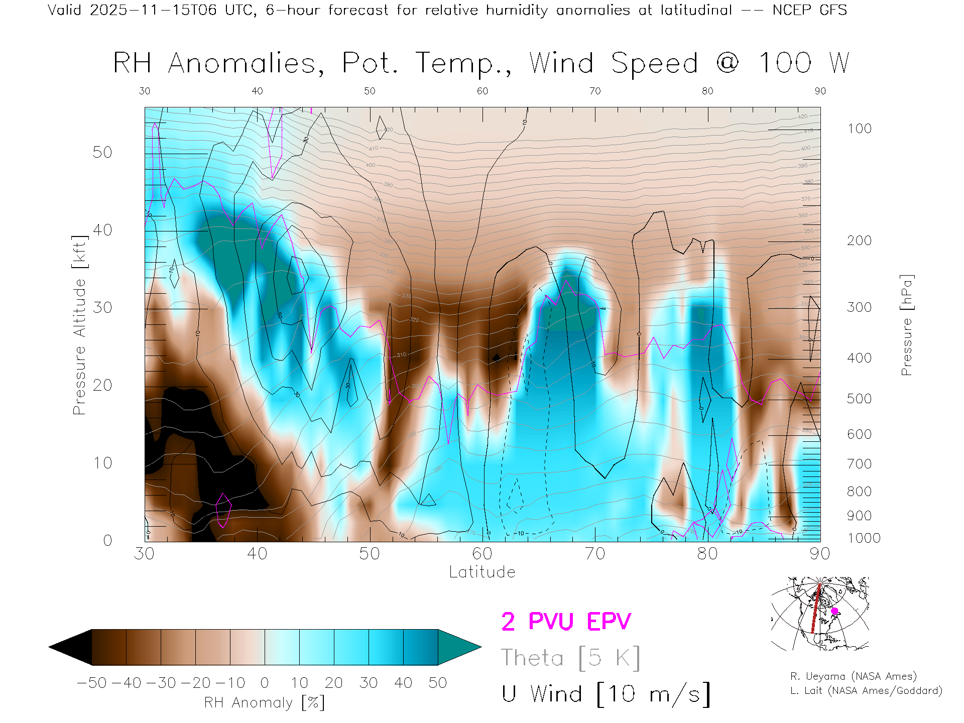 NCEP GFS Forecast Rel. Hum. X-Section (100 W)
