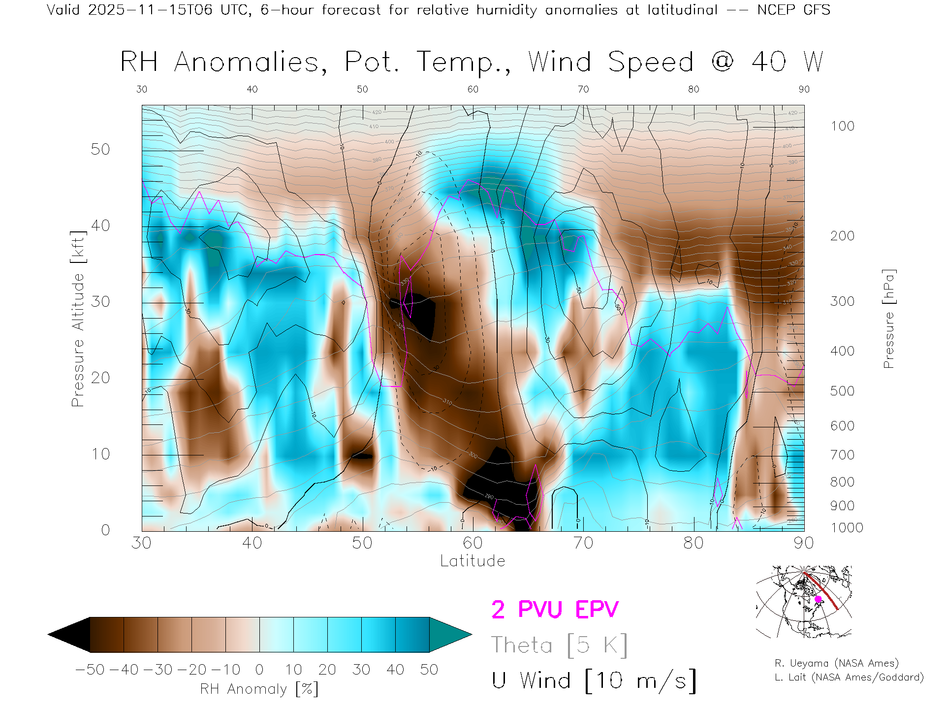 NCEP GFS Forecast Rel. Hum. X-Section (40 W)