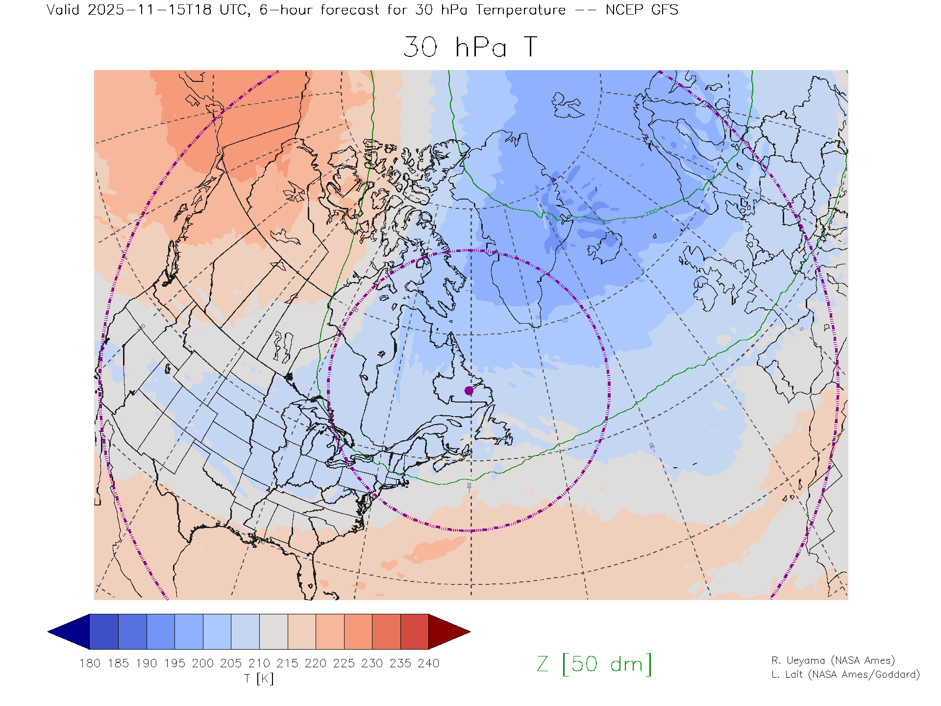 NCEP GFS Forecast 30 hPa Temp.