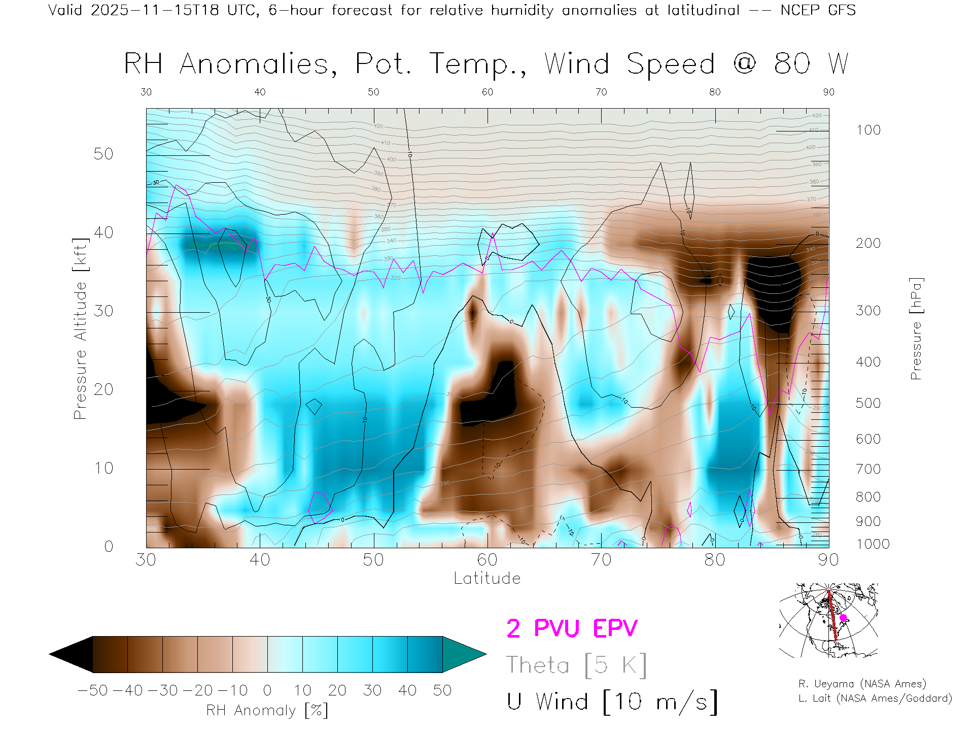 NCEP GFS Forecast Rel. Hum. X-Section (80 W)
