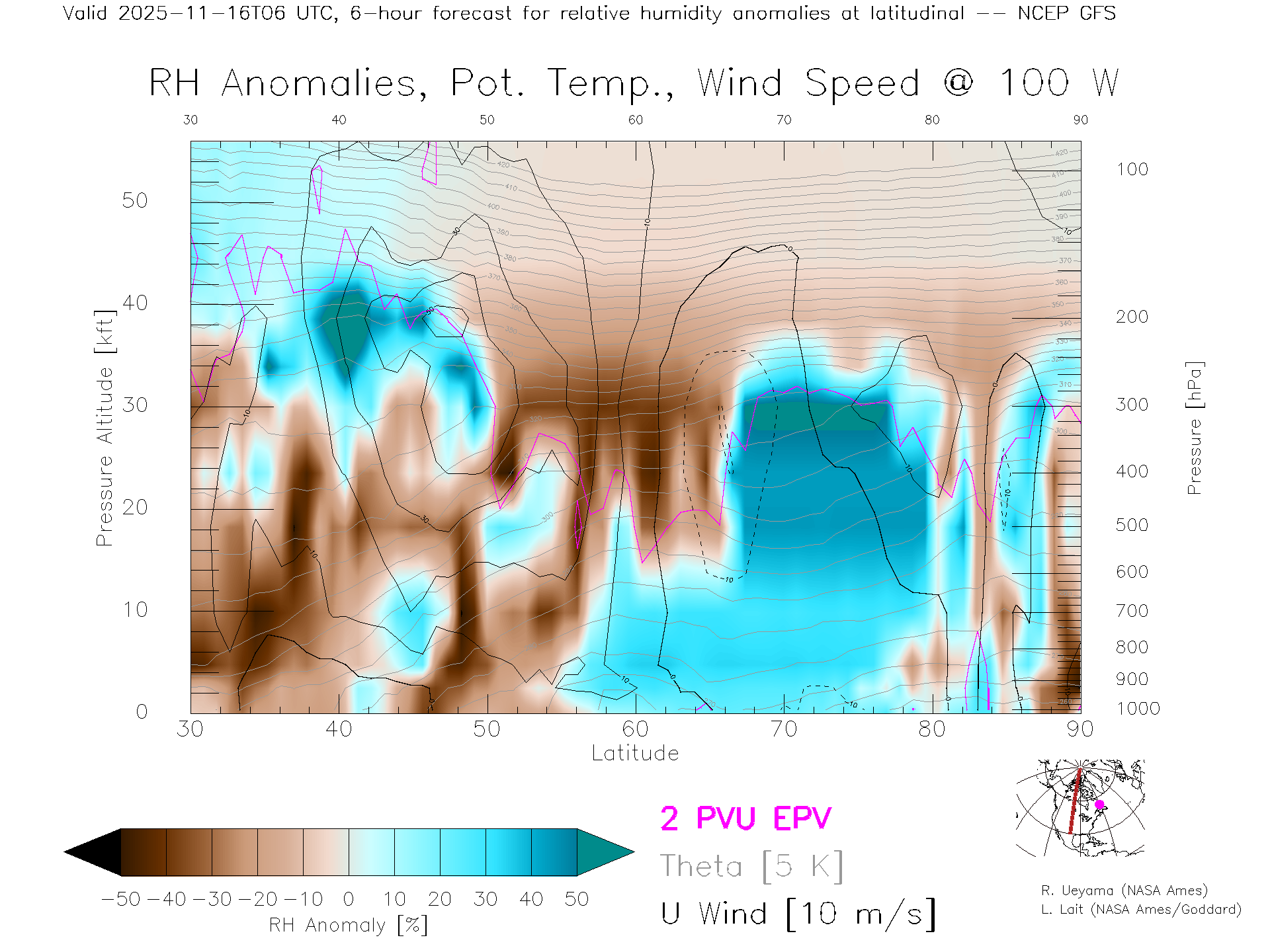 NCEP GFS Forecast Rel. Hum. X-Section (100 W)