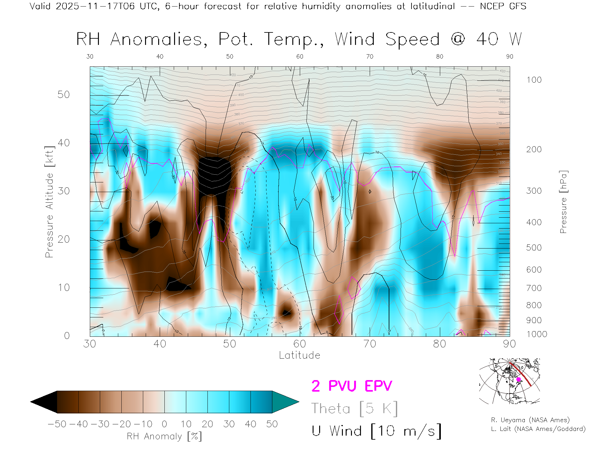 NCEP GFS Forecast Rel. Hum. X-Section (40 W)