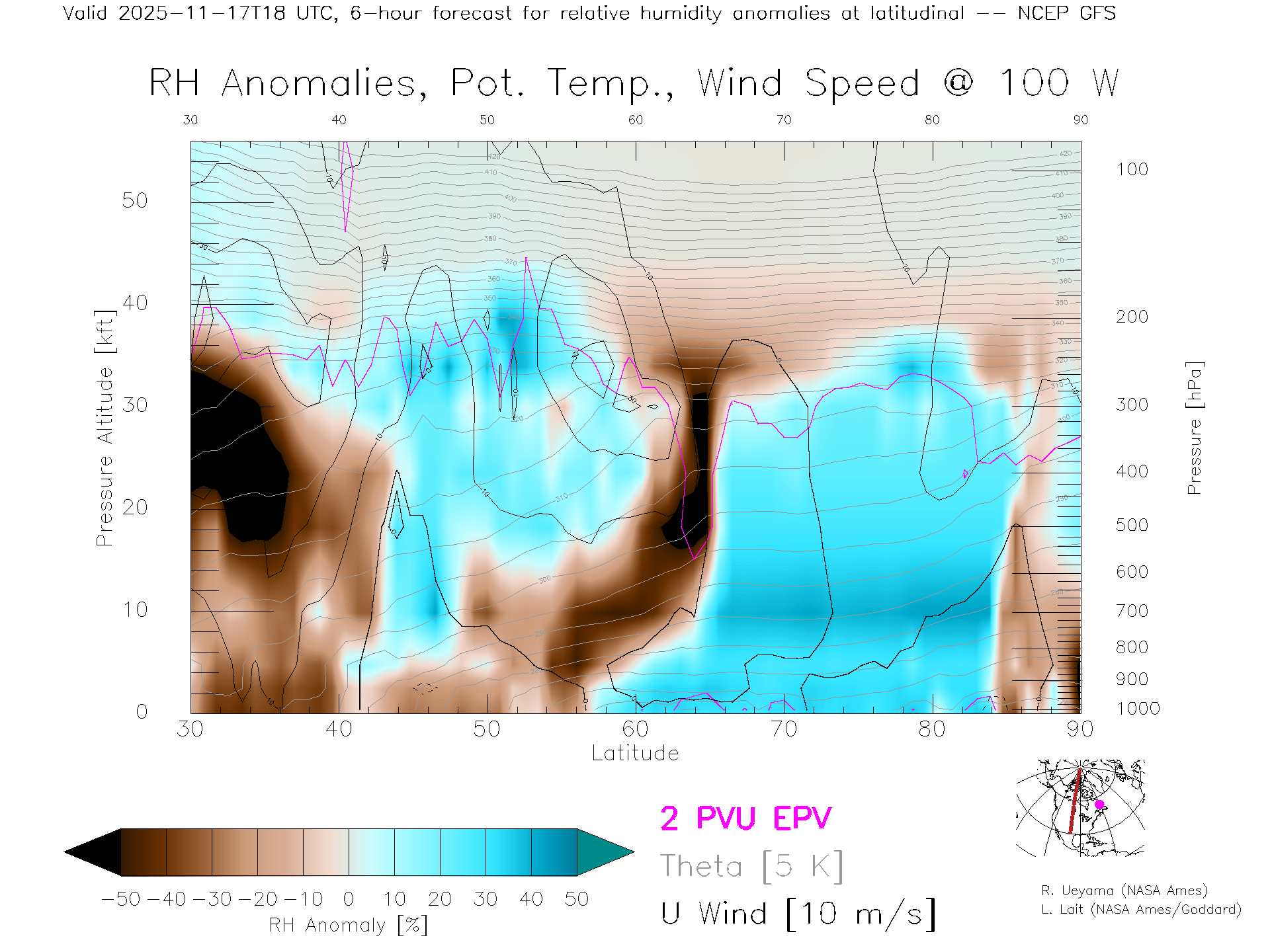 NCEP GFS Forecast Rel. Hum. X-Section (100 W)