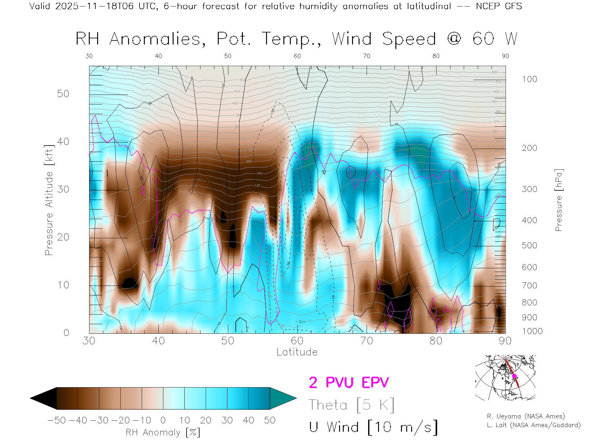 NCEP GFS Forecast Rel. Hum. X-Section (60 W)
