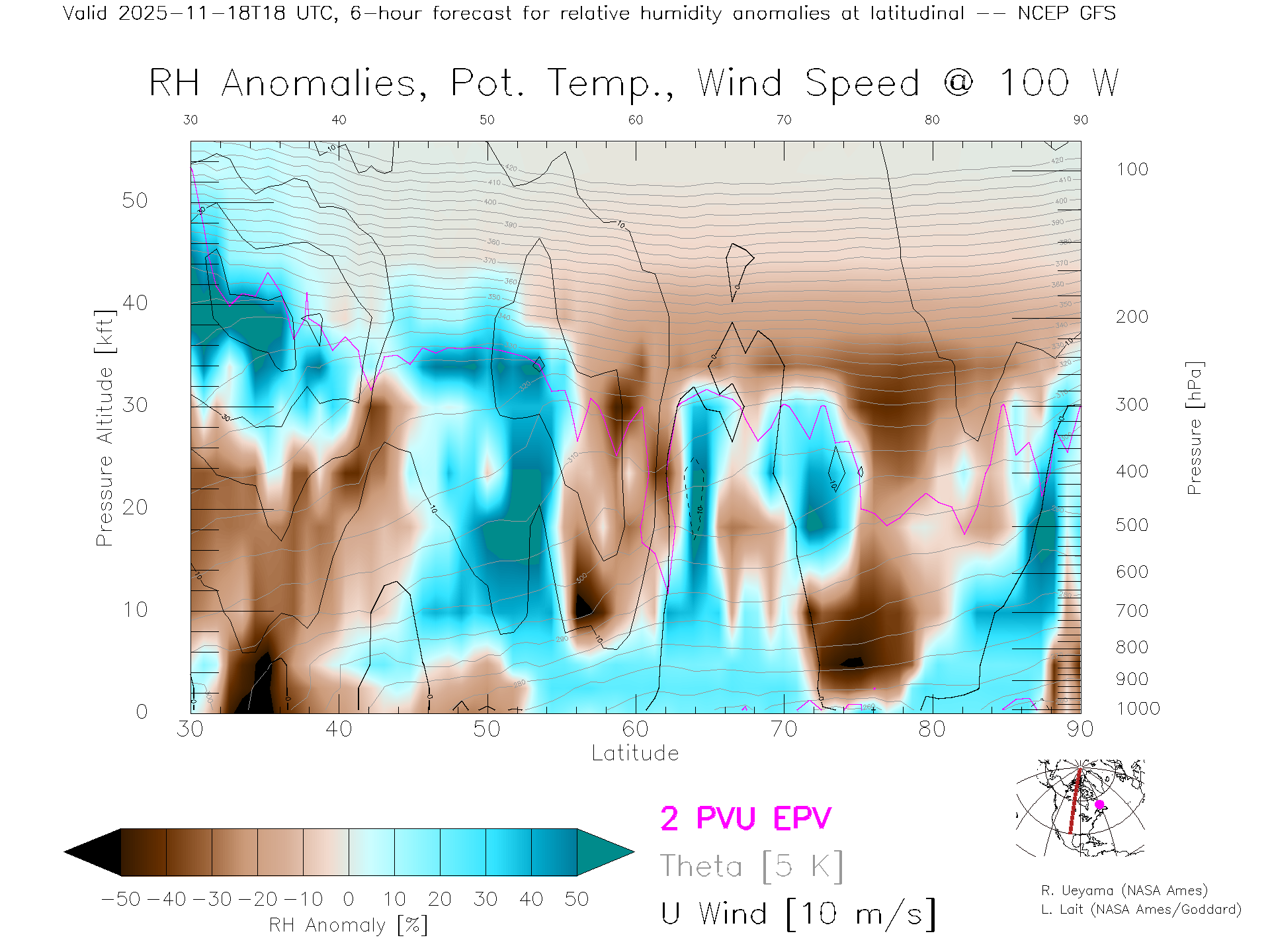 NCEP GFS Forecast Rel. Hum. X-Section (100 W)