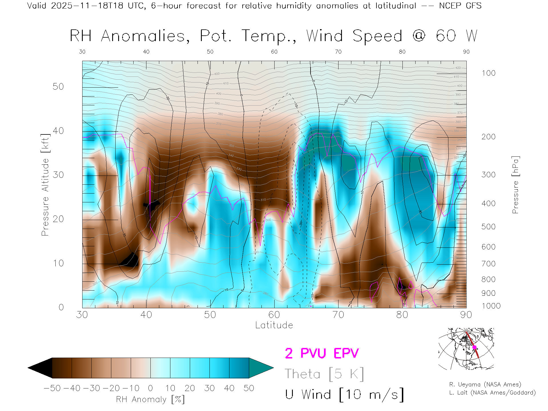 NCEP GFS Forecast Rel. Hum. X-Section (60 W)