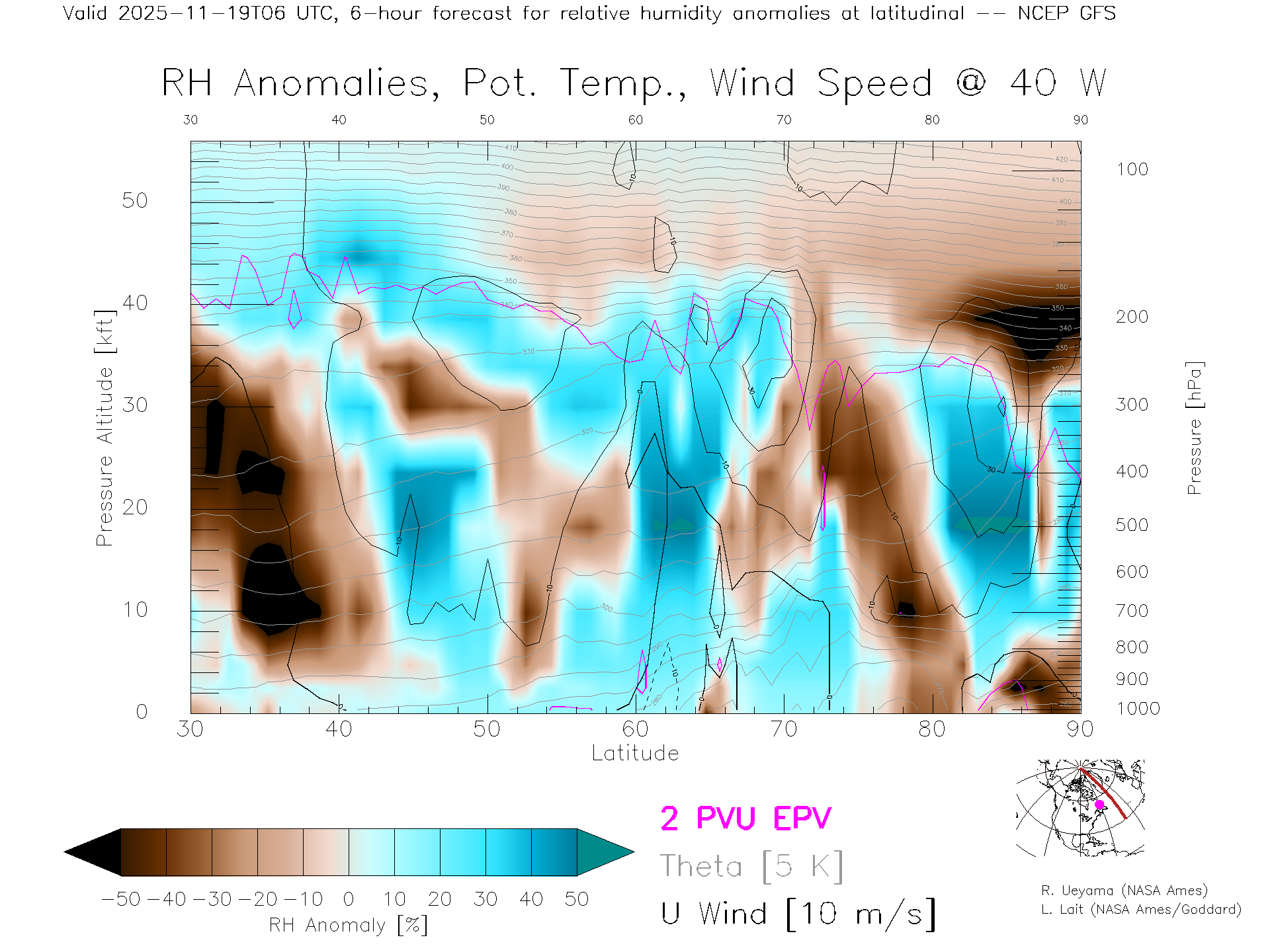 NCEP GFS Forecast Rel. Hum. X-Section (40 W)