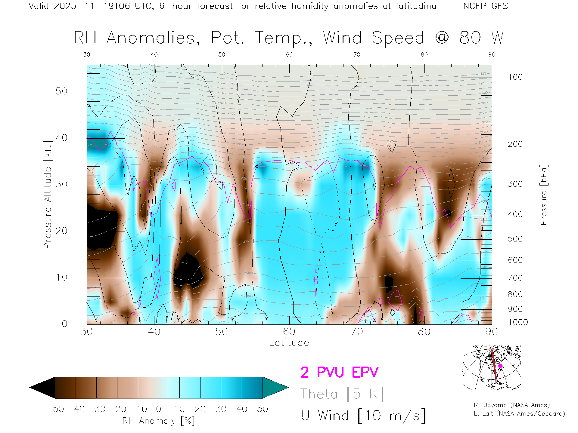 NCEP GFS Forecast Rel. Hum. X-Section (80 W)