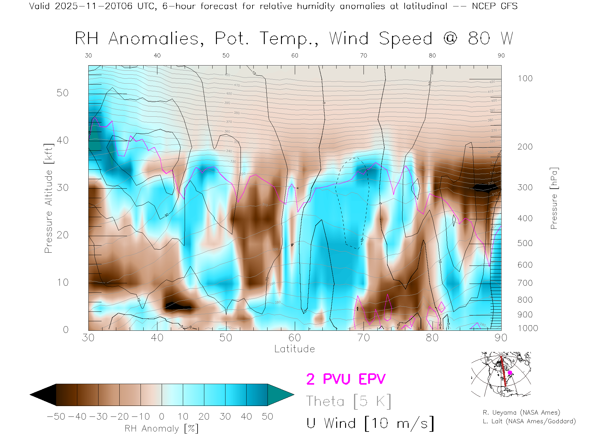 NCEP GFS Forecast Rel. Hum. X-Section (80 W)