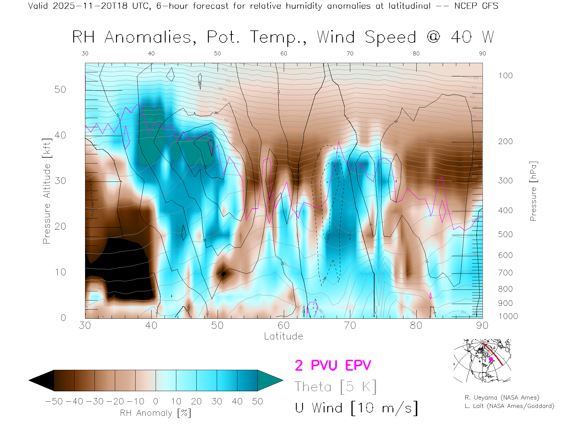 NCEP GFS Forecast Rel. Hum. X-Section (40 W)
