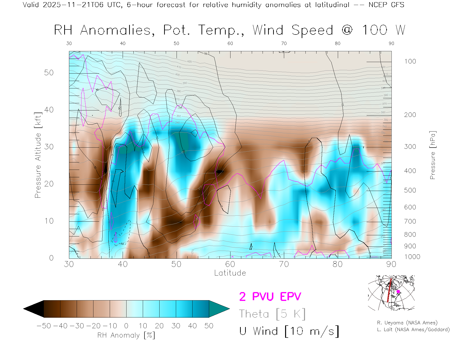 NCEP GFS Forecast Rel. Hum. X-Section (100 W)
