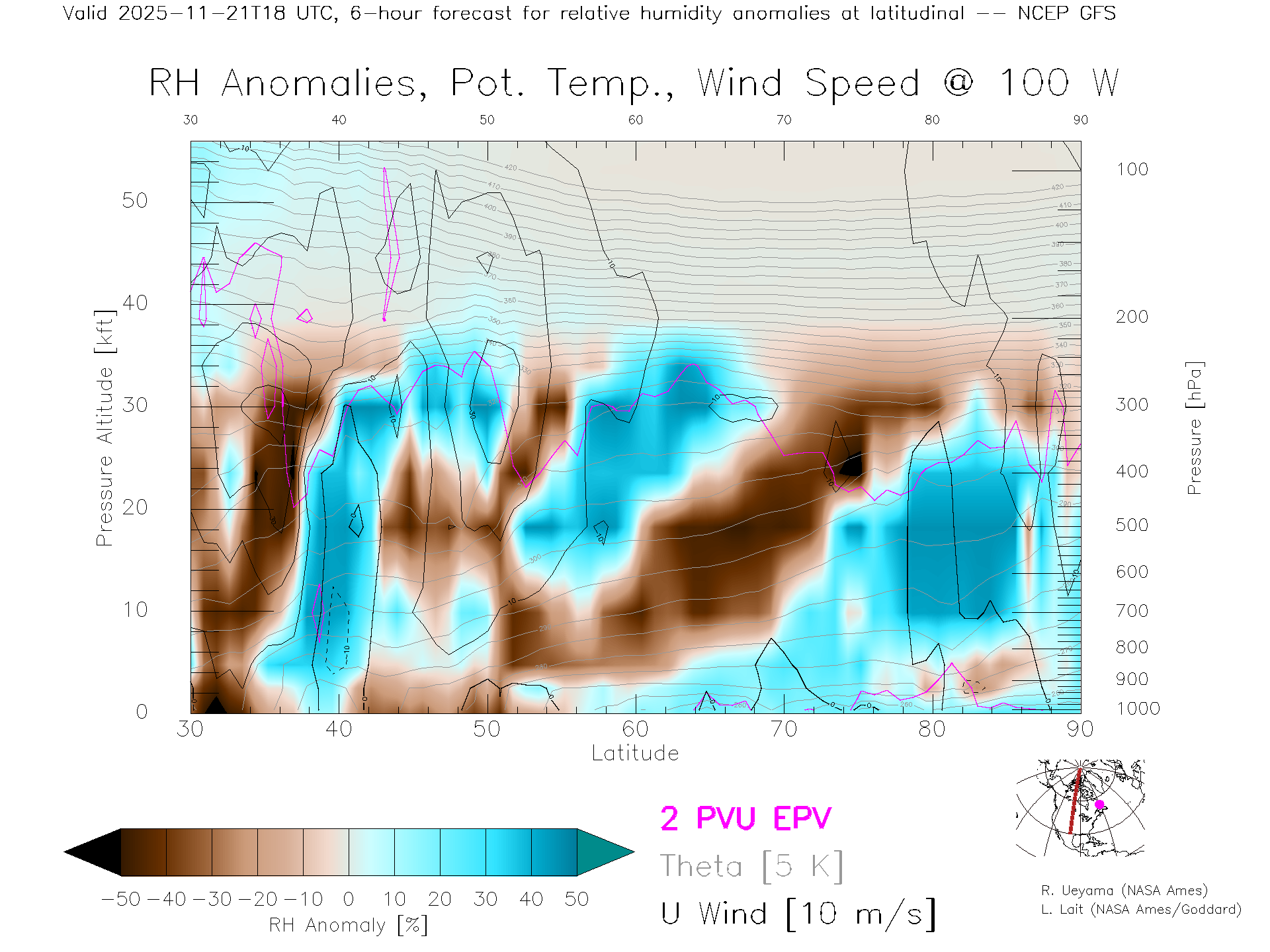 NCEP GFS Forecast Rel. Hum. X-Section (100 W)