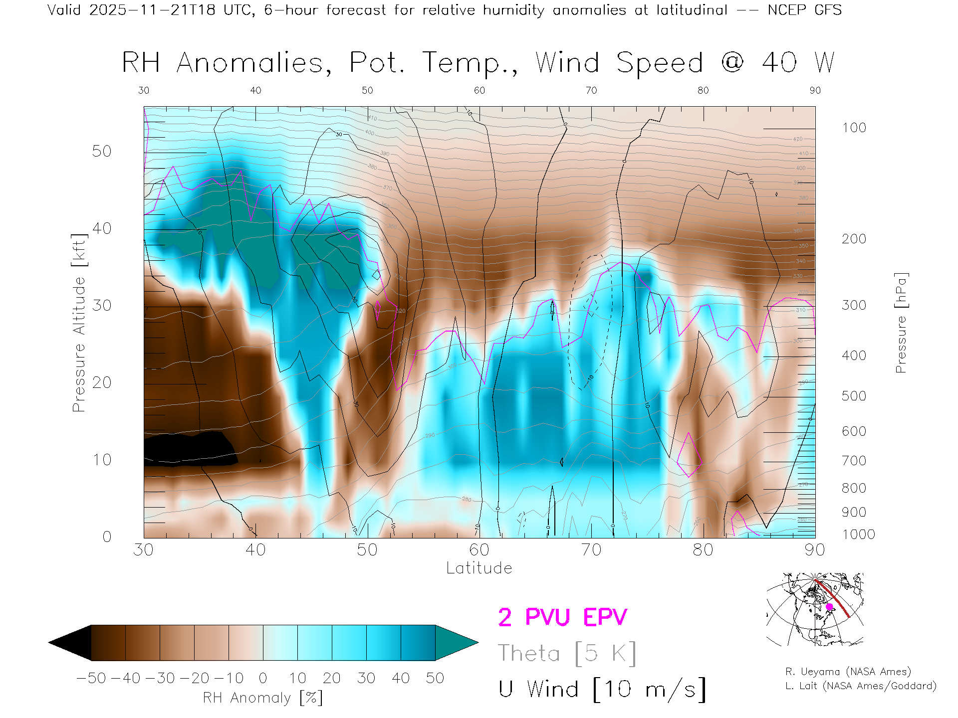 NCEP GFS Forecast Rel. Hum. X-Section (40 W)