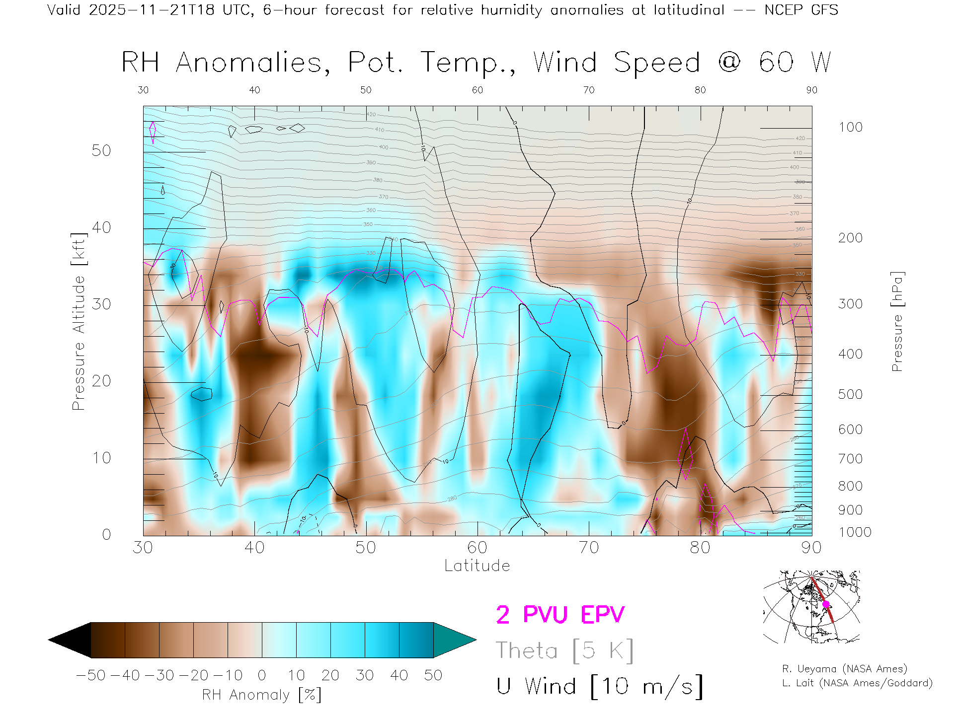 NCEP GFS Forecast Rel. Hum. X-Section (60 W)