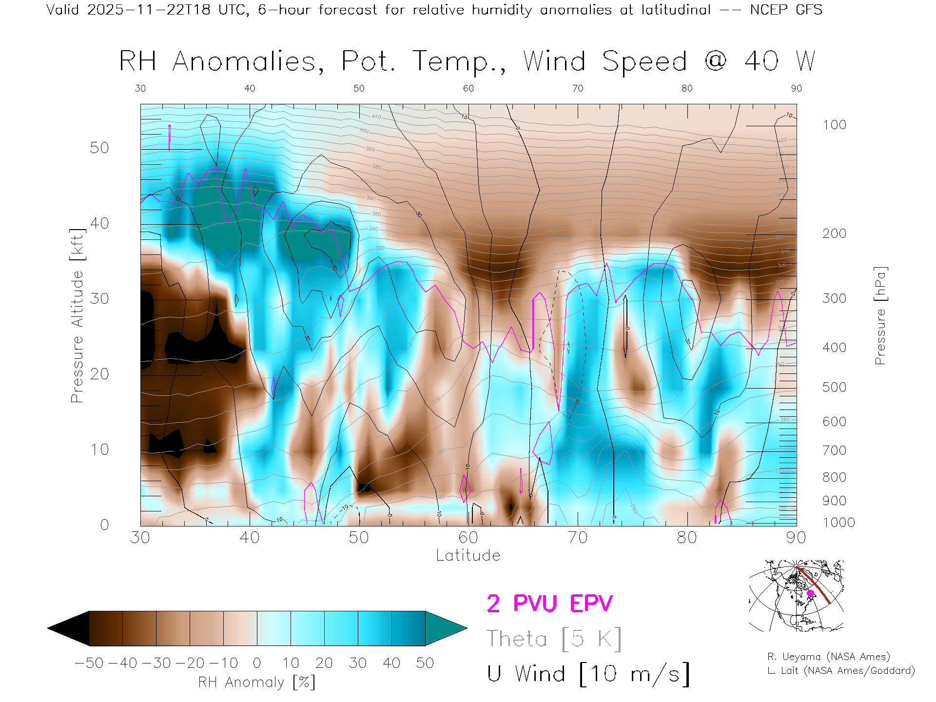 NCEP GFS Forecast Rel. Hum. X-Section (40 W)