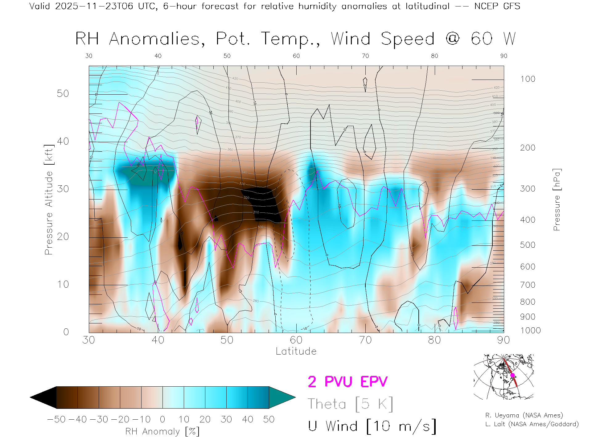 NCEP GFS Forecast Rel. Hum. X-Section (60 W)