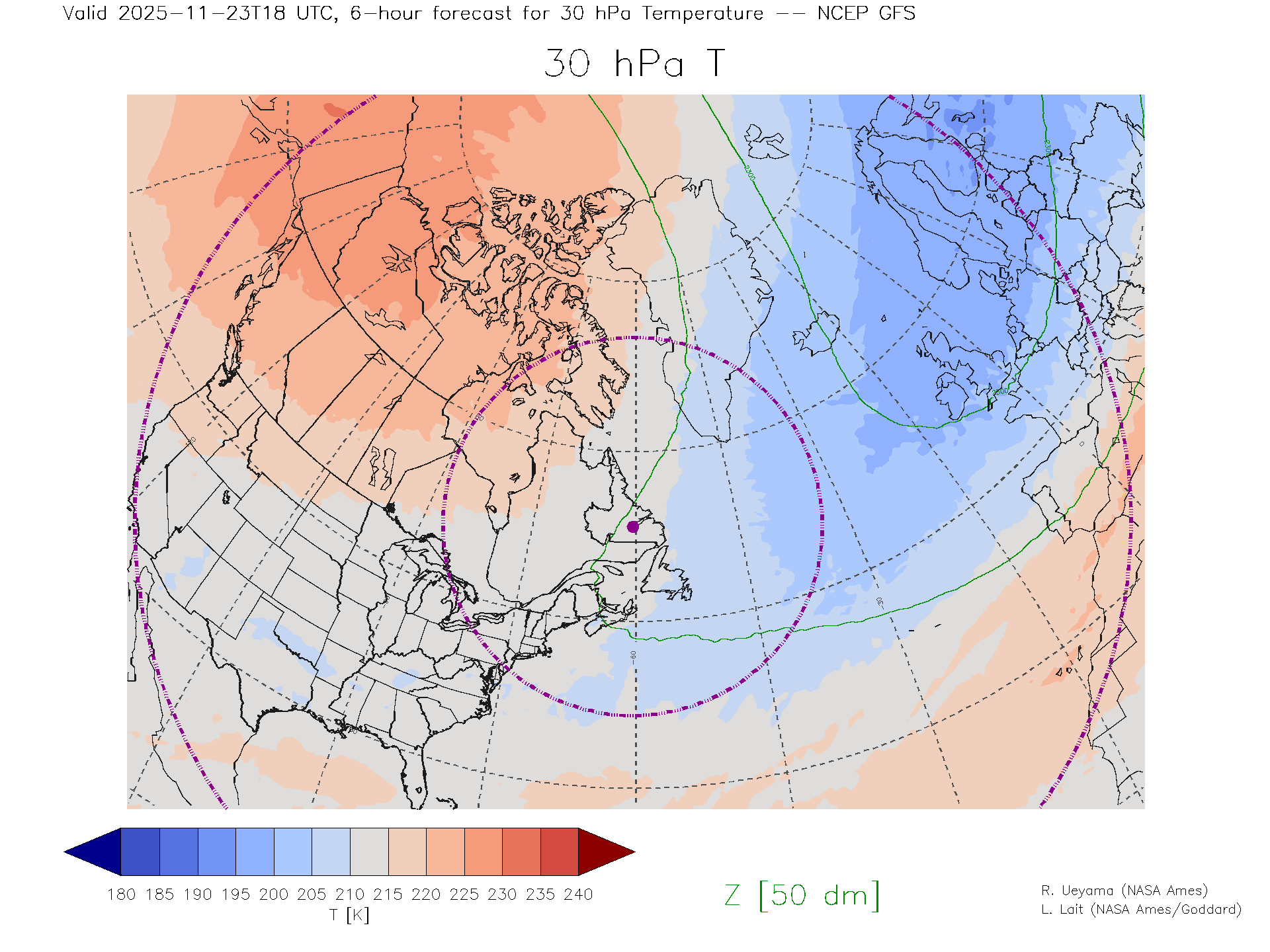 NCEP GFS Forecast 30 hPa Temp.