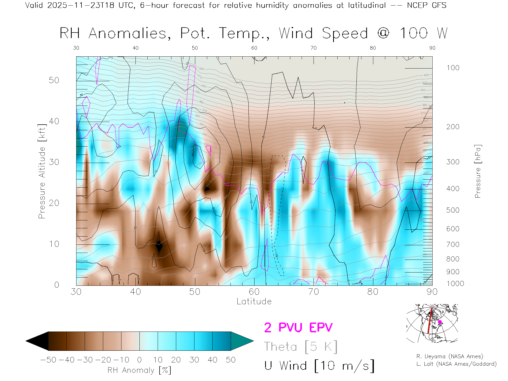 NCEP GFS Forecast Rel. Hum. X-Section (100 W)