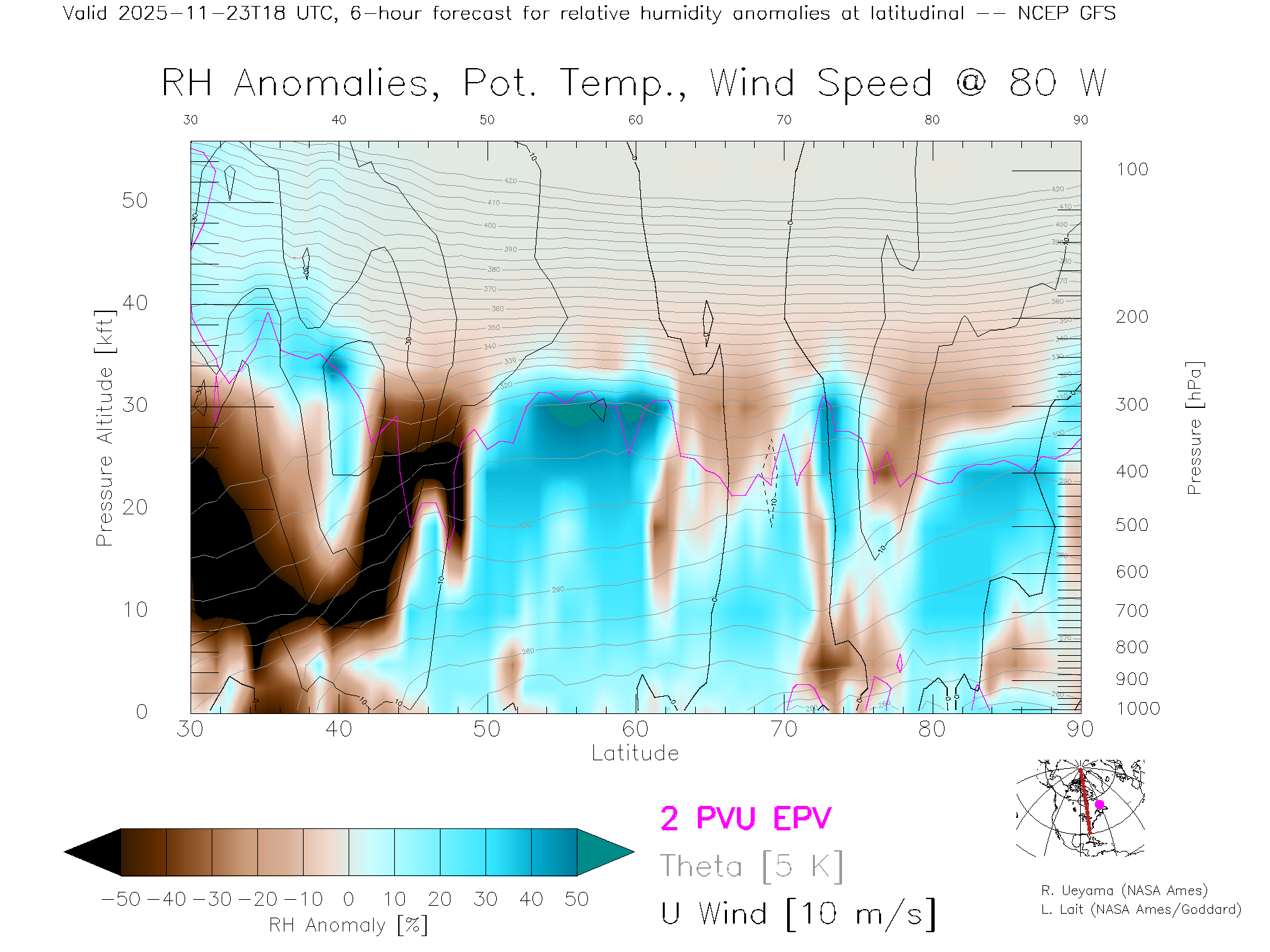 NCEP GFS Forecast Rel. Hum. X-Section (80 W)