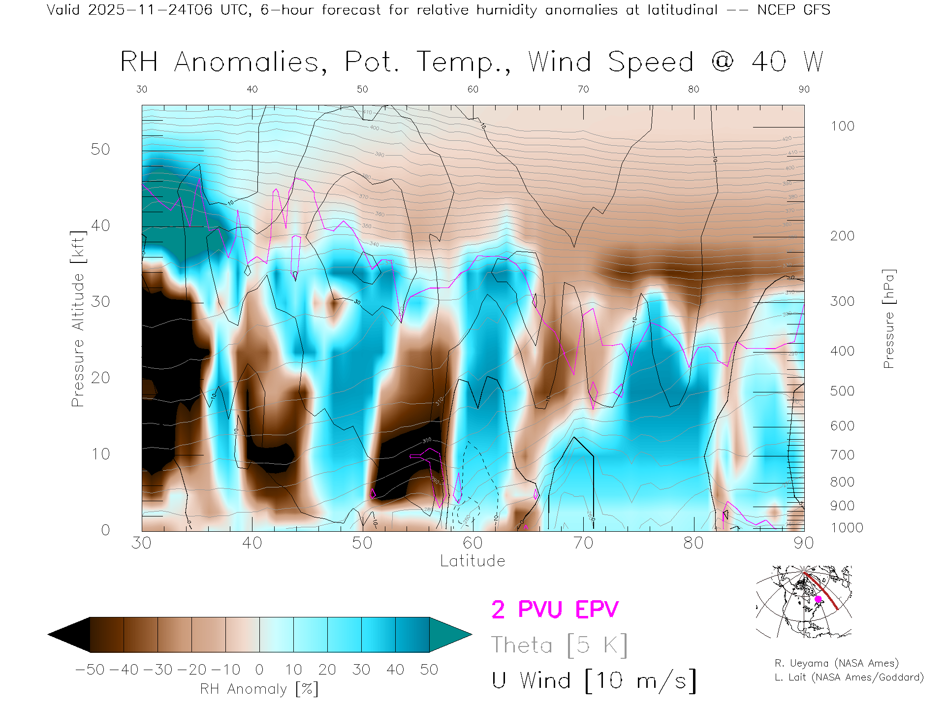 NCEP GFS Forecast Rel. Hum. X-Section (40 W)