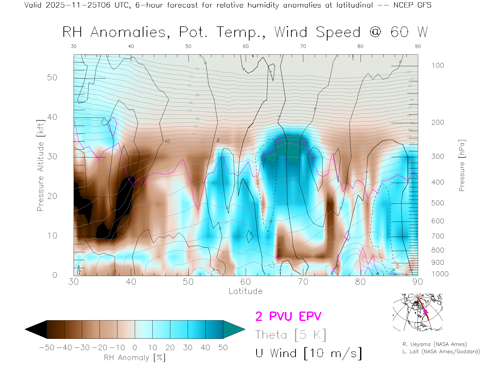 NCEP GFS Forecast Rel. Hum. X-Section (60 W)