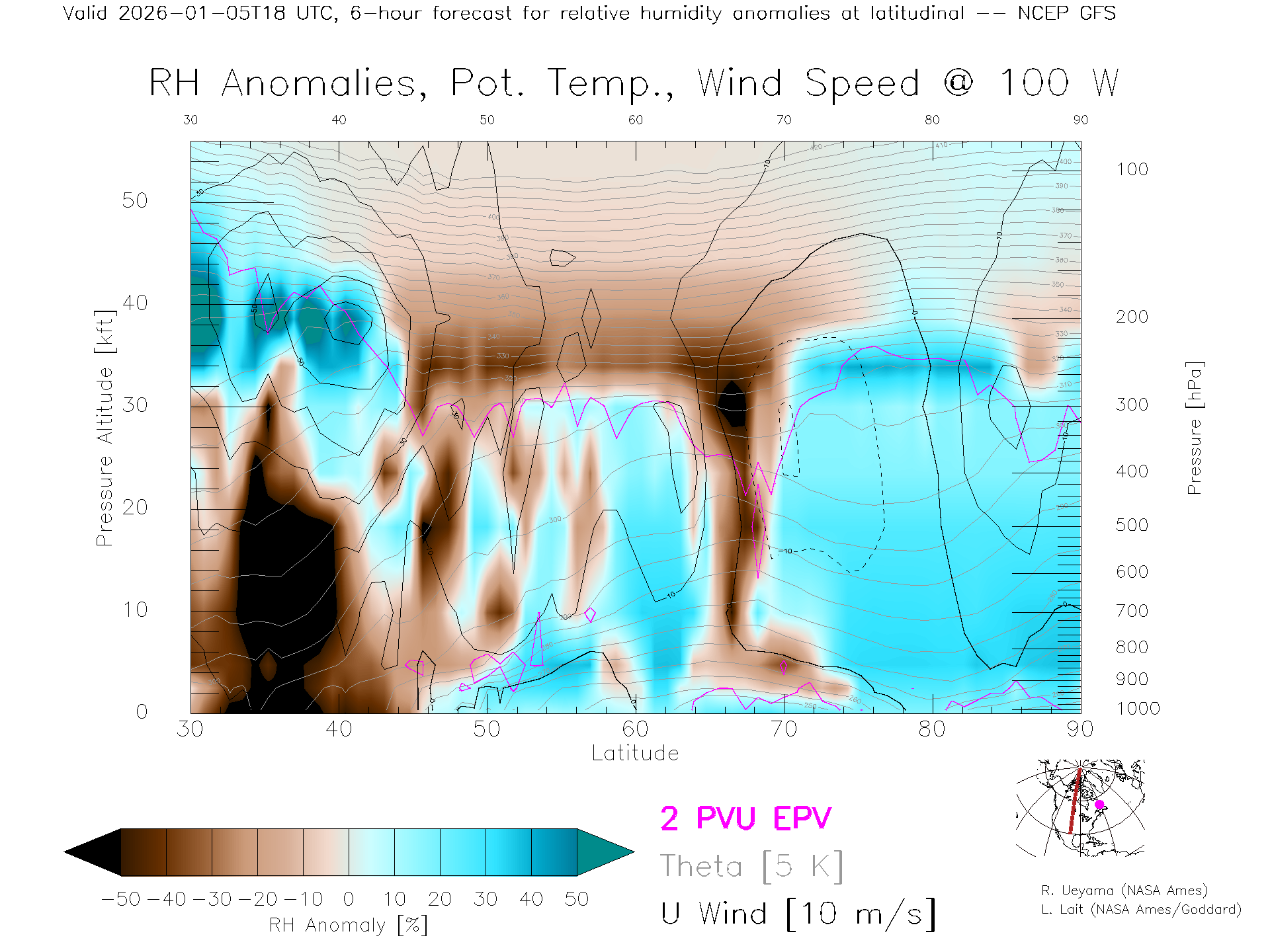 NCEP GFS Forecast Rel. Hum. X-Section (100 W)
