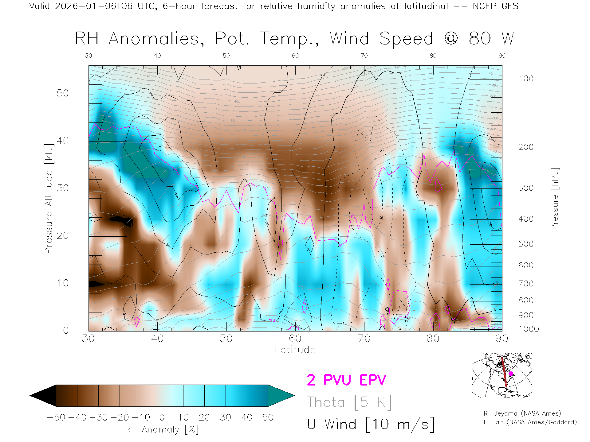 NCEP GFS Forecast Rel. Hum. X-Section (80 W)