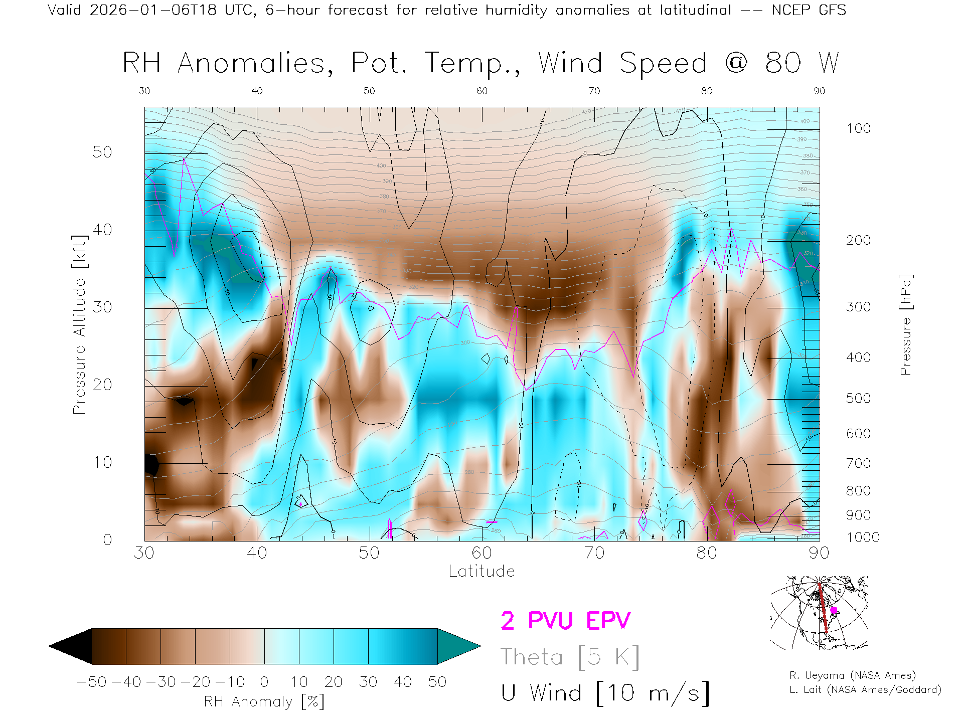 NCEP GFS Forecast Rel. Hum. X-Section (80 W)