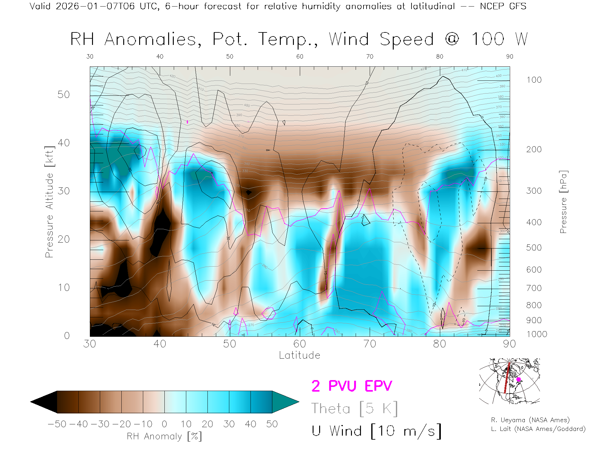 NCEP GFS Forecast Rel. Hum. X-Section (100 W)