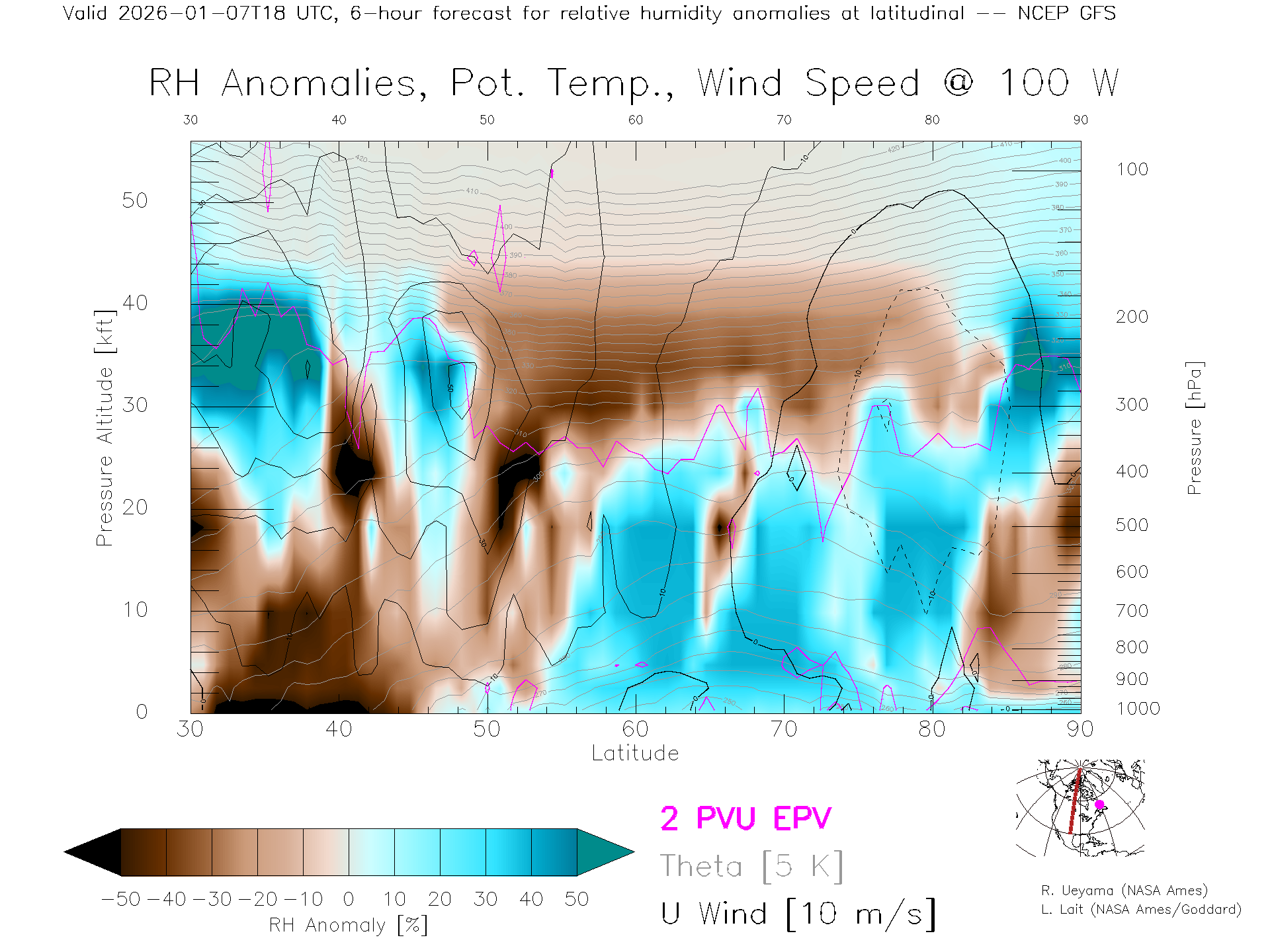 NCEP GFS Forecast Rel. Hum. X-Section (100 W)