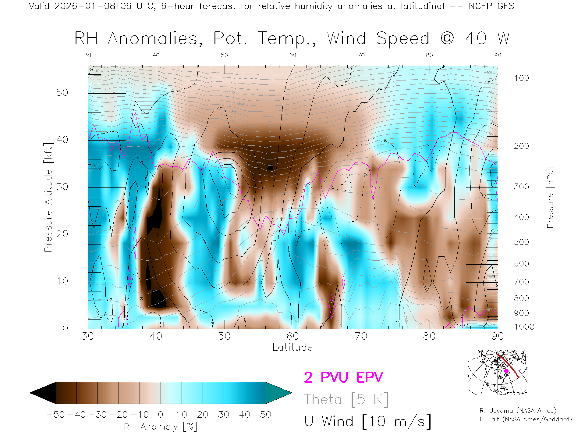 NCEP GFS Forecast Rel. Hum. X-Section (40 W)