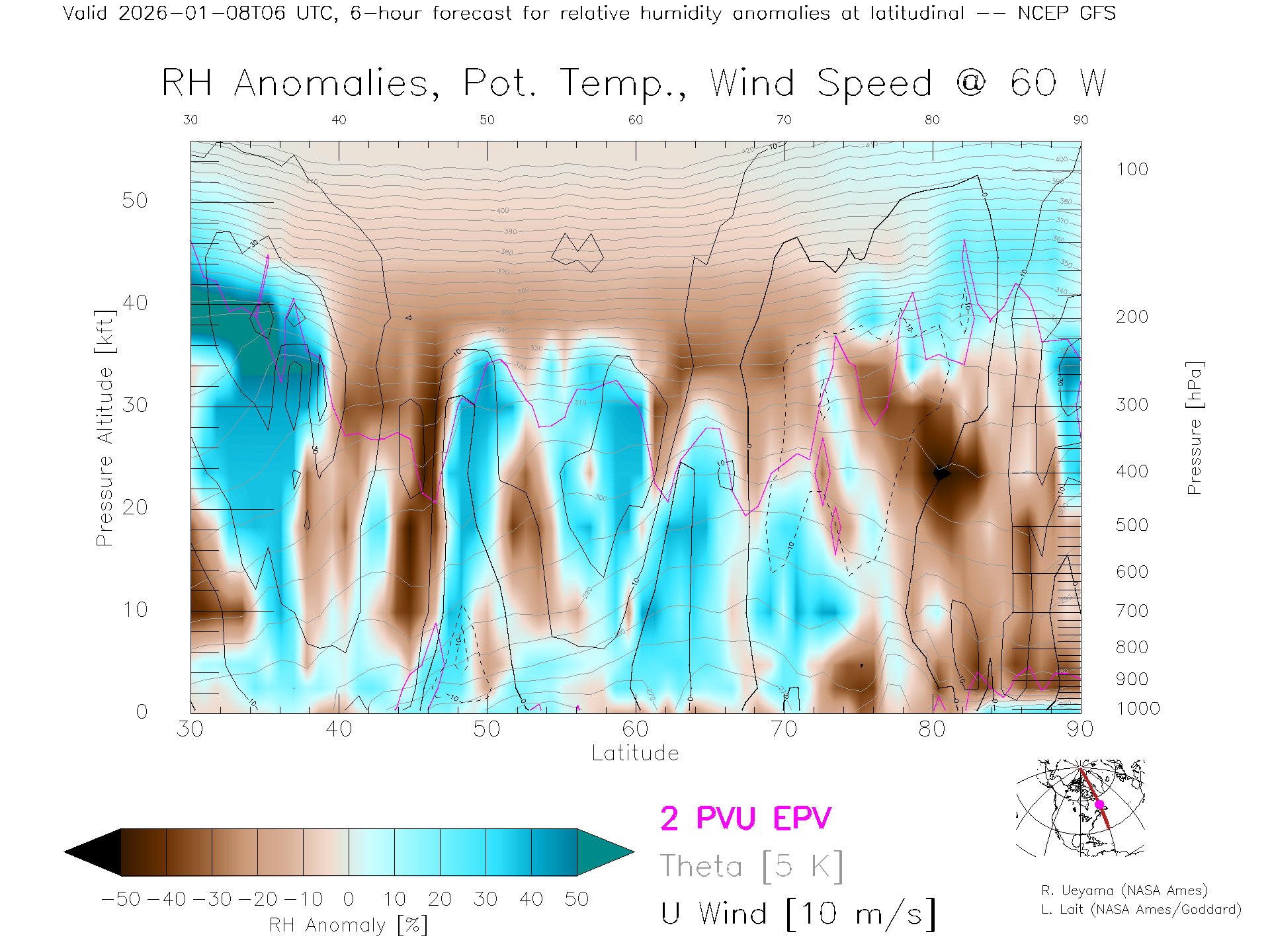 NCEP GFS Forecast Rel. Hum. X-Section (60 W)