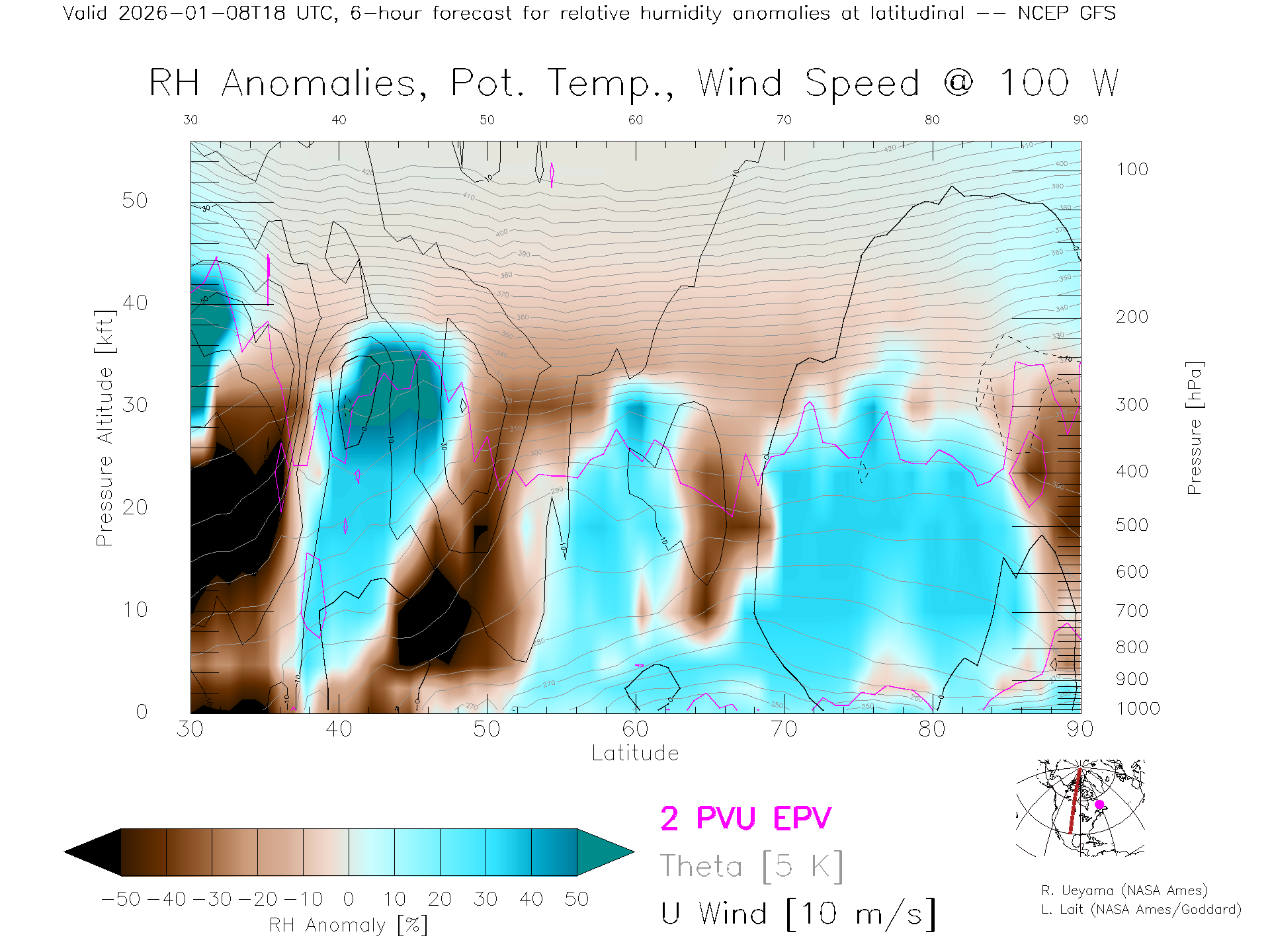 NCEP GFS Forecast Rel. Hum. X-Section (100 W)