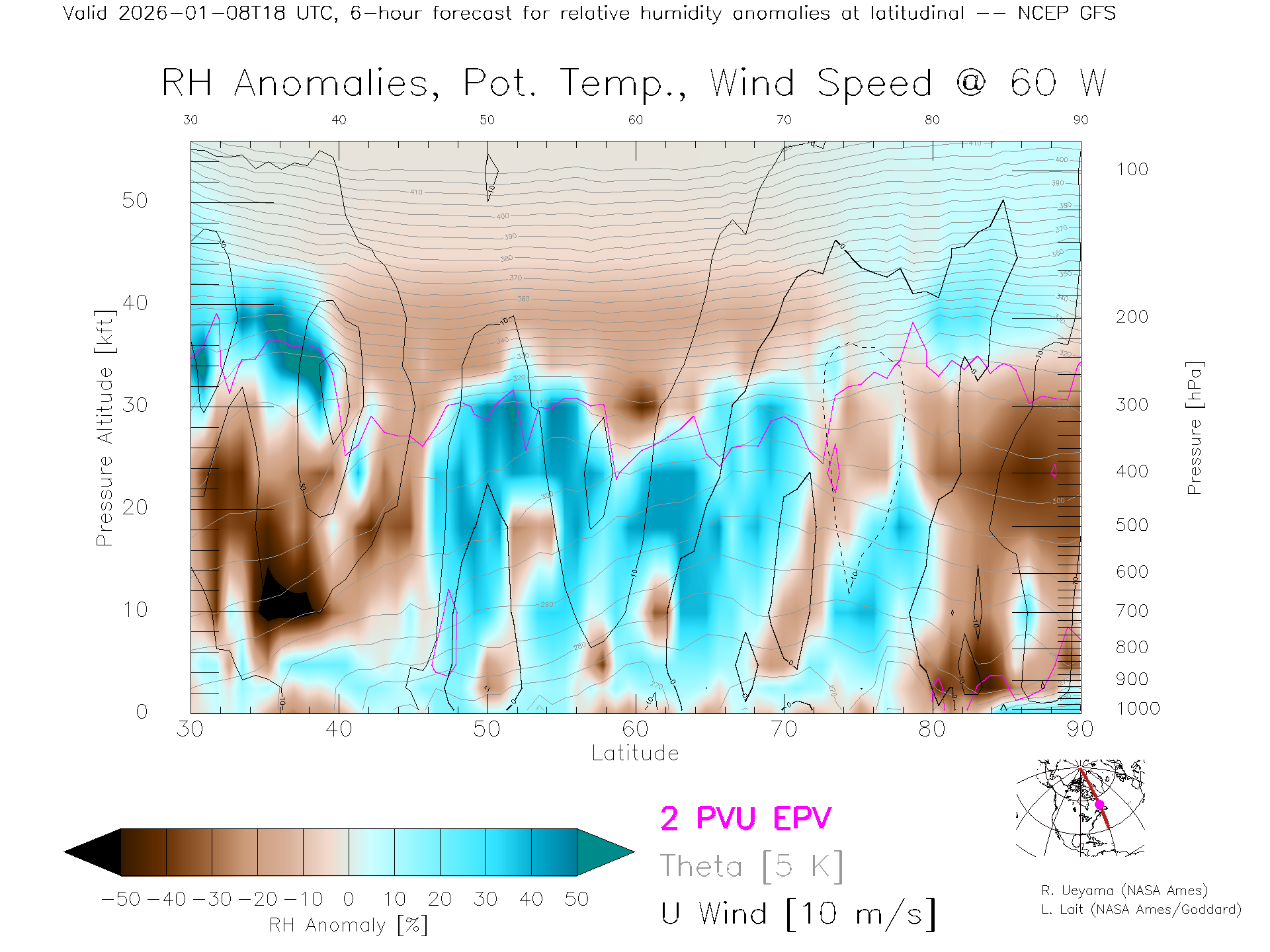 NCEP GFS Forecast Rel. Hum. X-Section (60 W)