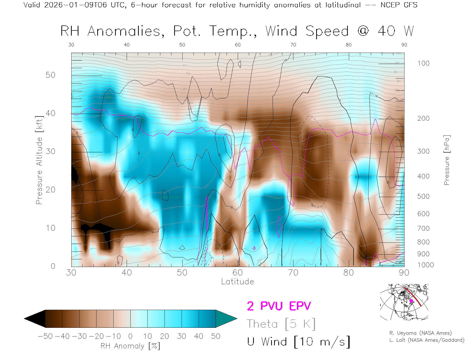 NCEP GFS Forecast Rel. Hum. X-Section (40 W)