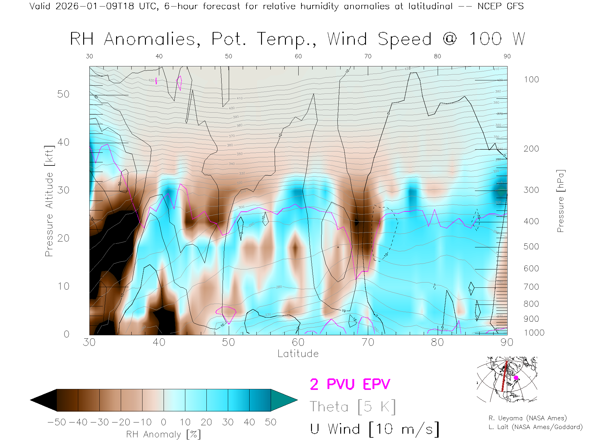 NCEP GFS Forecast Rel. Hum. X-Section (100 W)