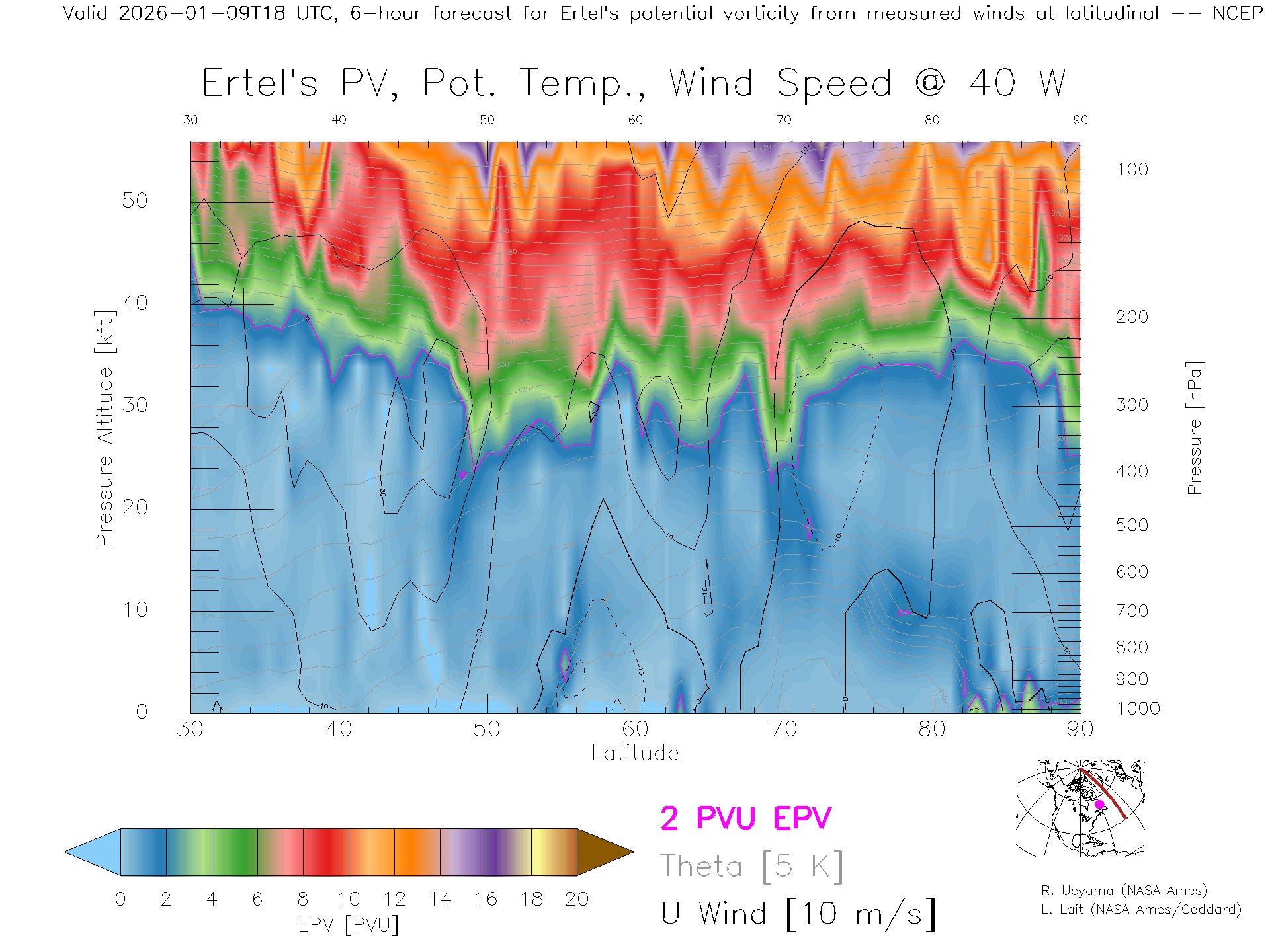 NCEP GFS Forecast PV X-Section (40 W)