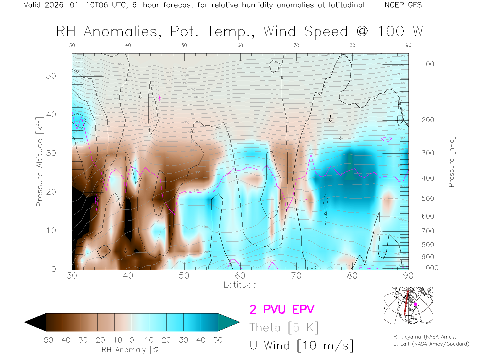 NCEP GFS Forecast Rel. Hum. X-Section (100 W)