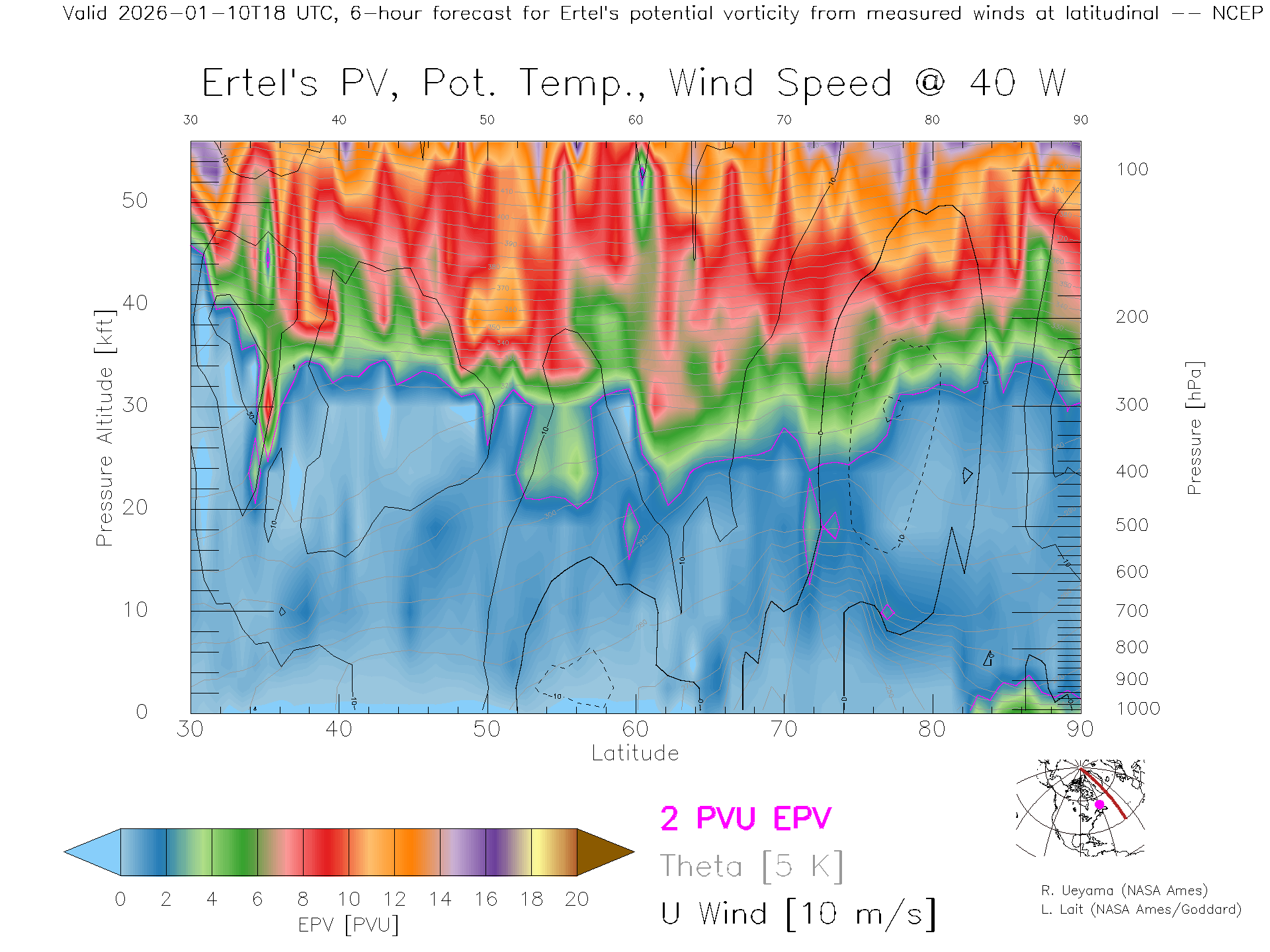 NCEP GFS Forecast PV X-Section (40 W)
