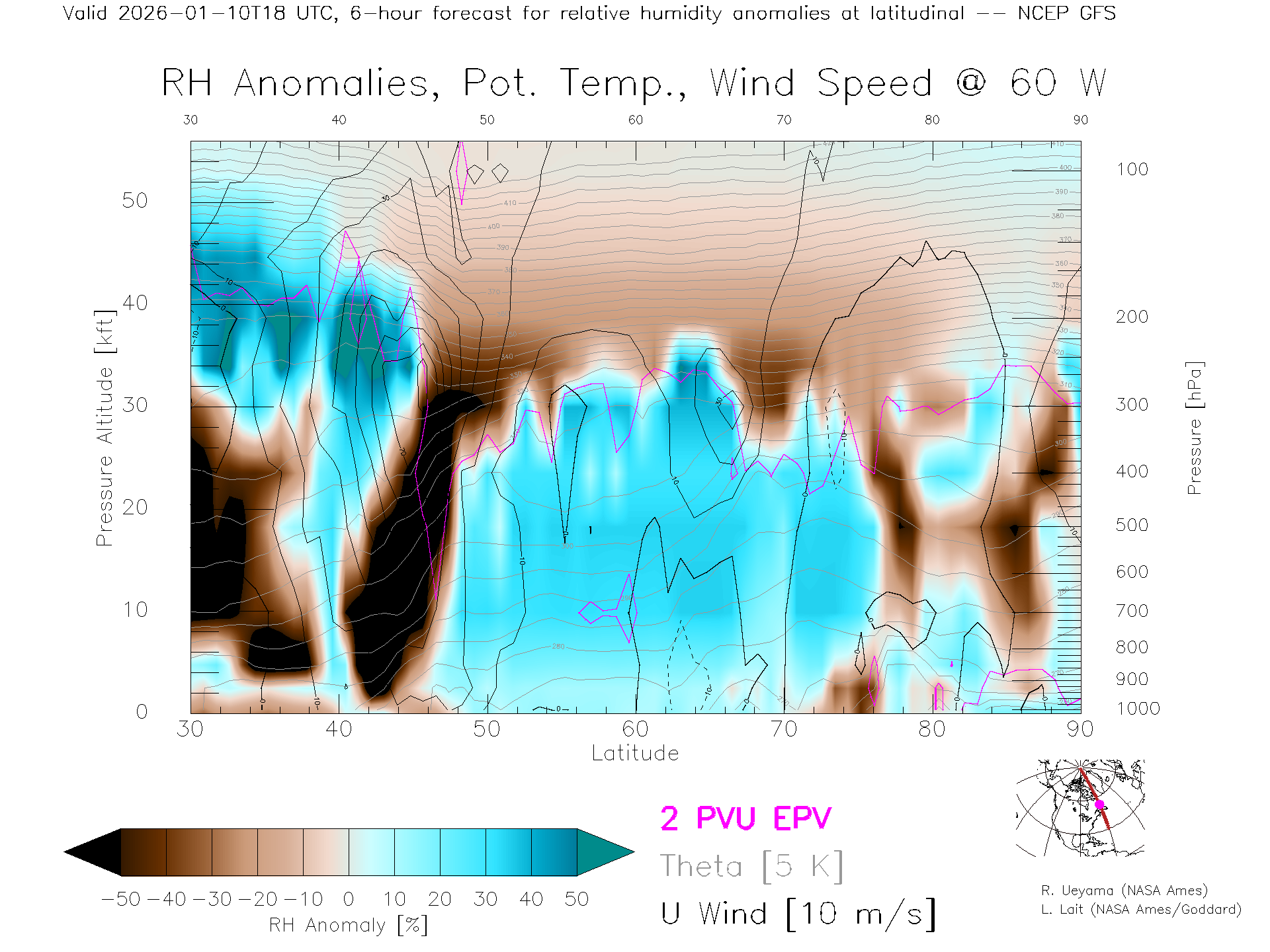 NCEP GFS Forecast Rel. Hum. X-Section (60 W)