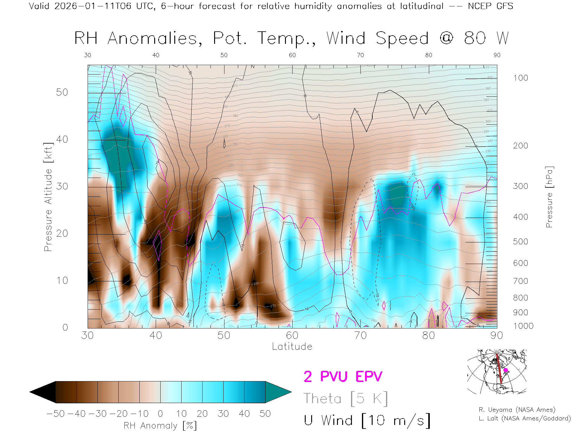 NCEP GFS Forecast Rel. Hum. X-Section (80 W)