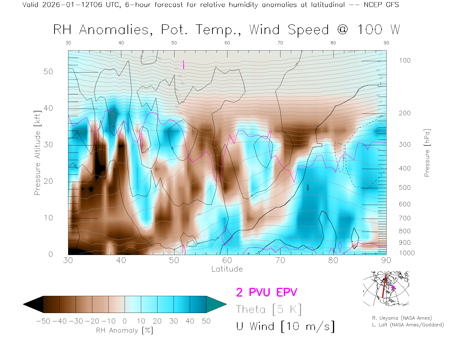 NCEP GFS Forecast Rel. Hum. X-Section (100 W)