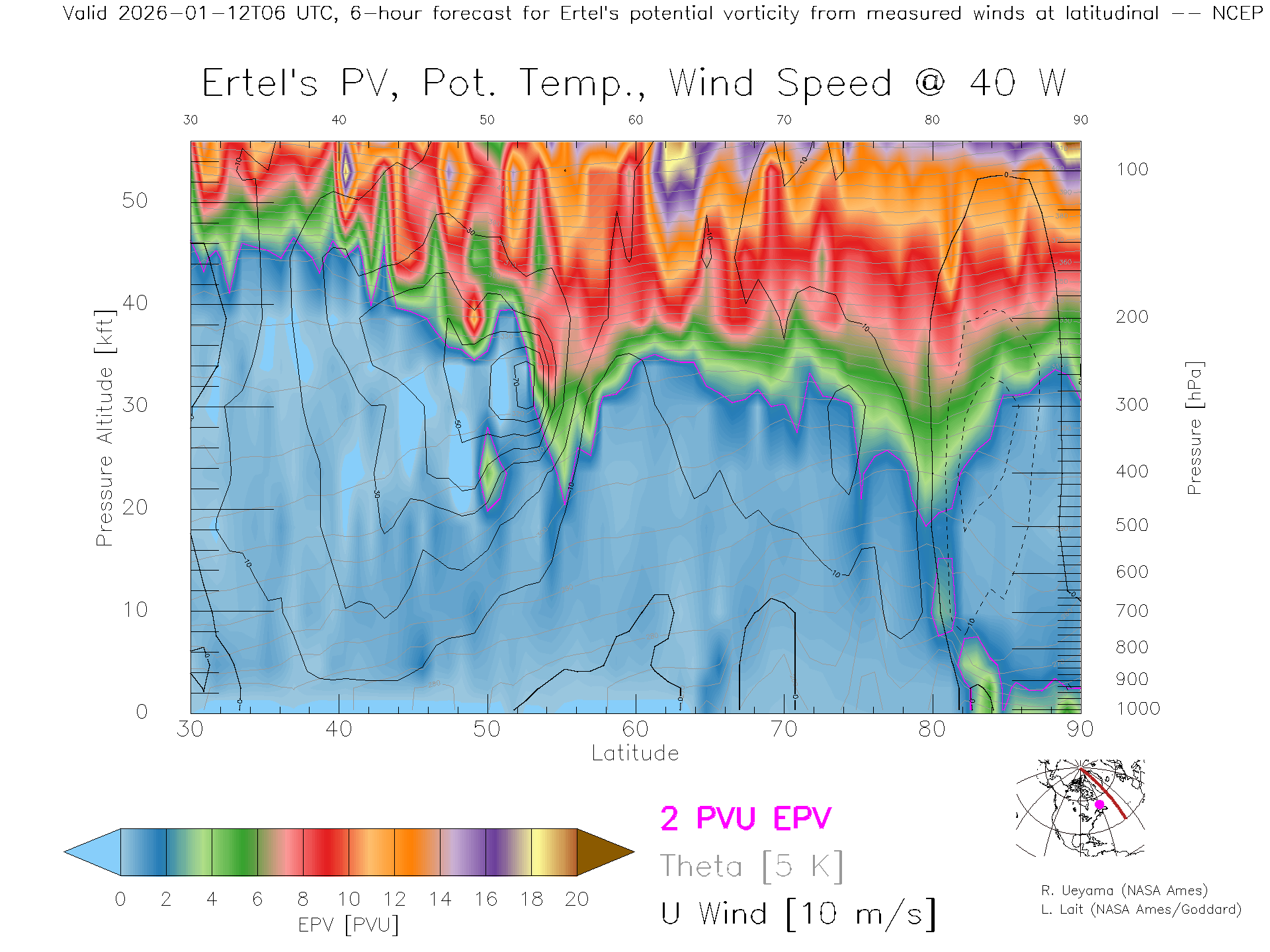 NCEP GFS Forecast PV X-Section (40 W)
