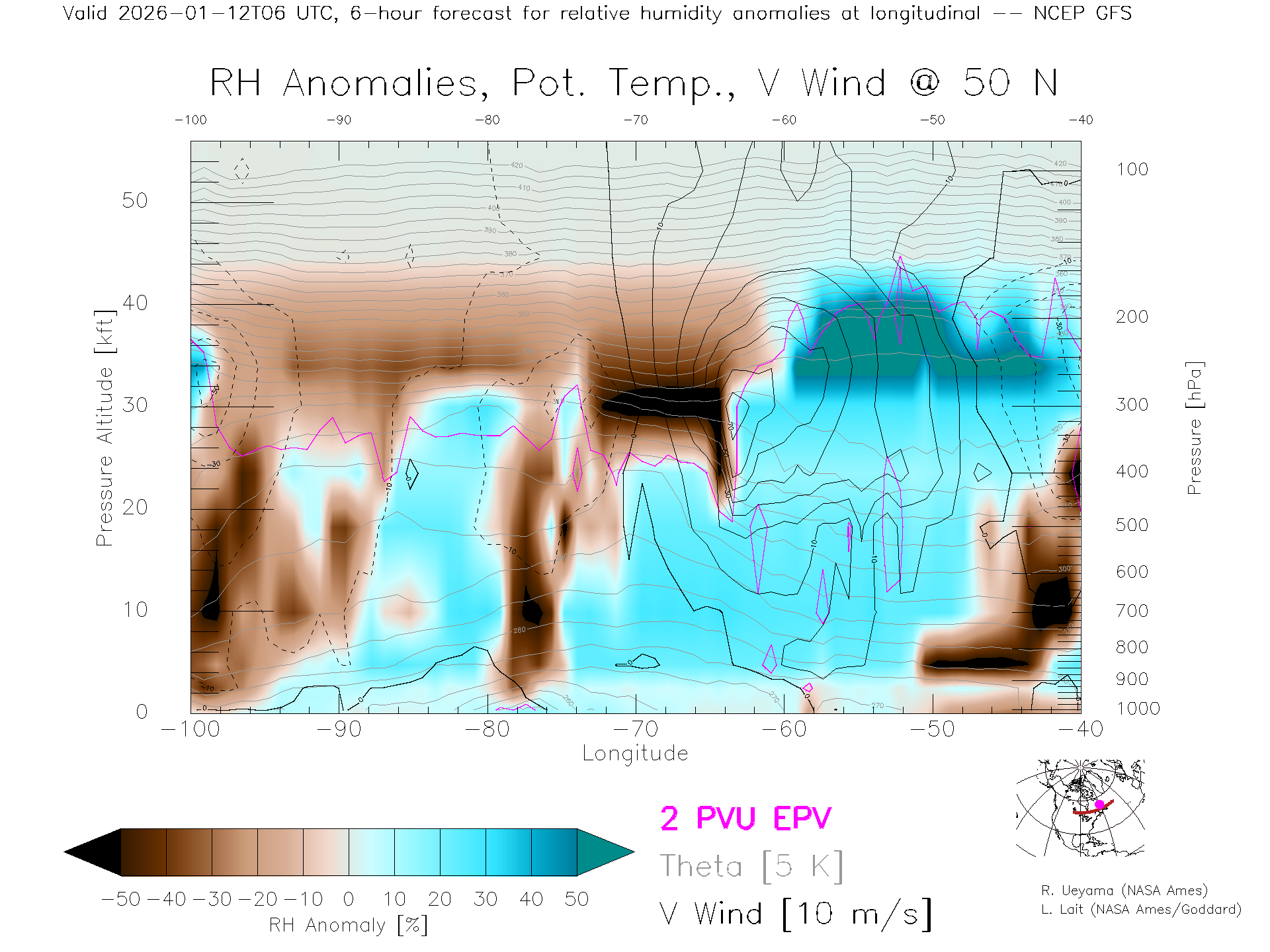 NCEP GFS Forecast Rel. Hum. X-Section (50 N)
