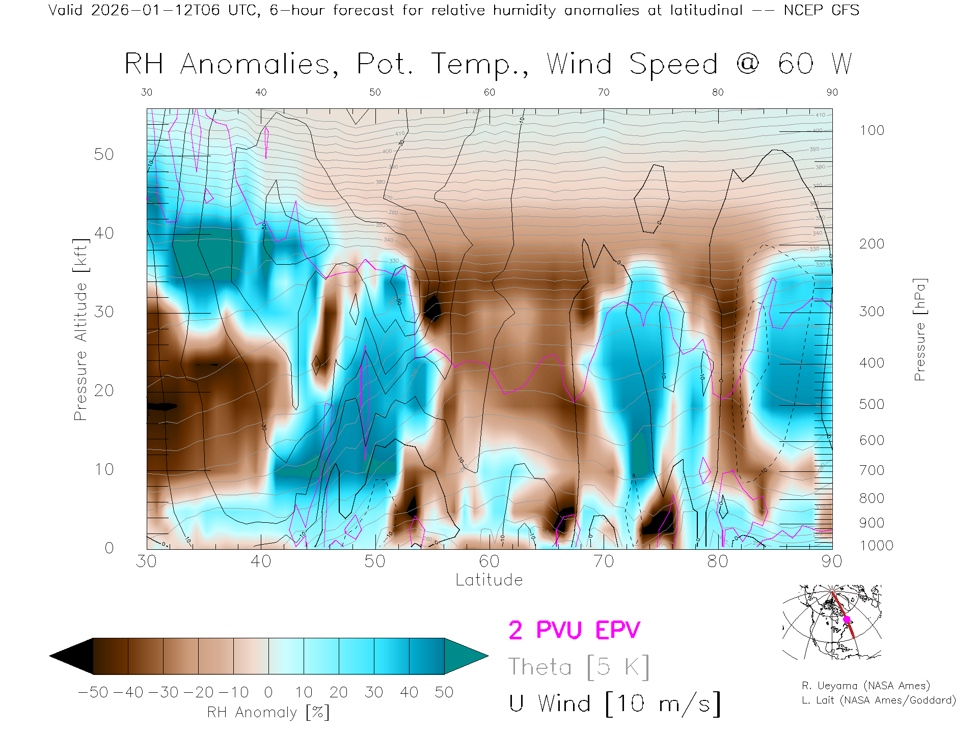 NCEP GFS Forecast Rel. Hum. X-Section (60 W)