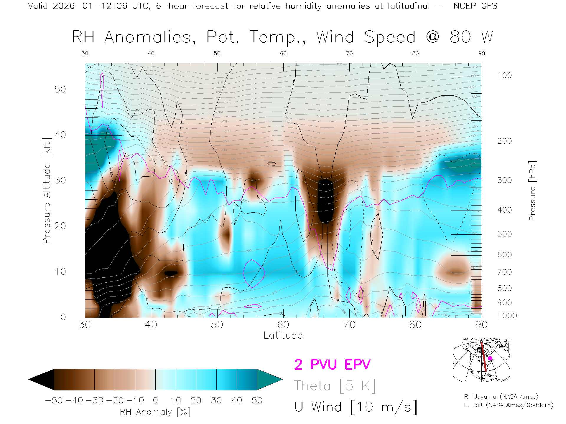 NCEP GFS Forecast Rel. Hum. X-Section (80 W)