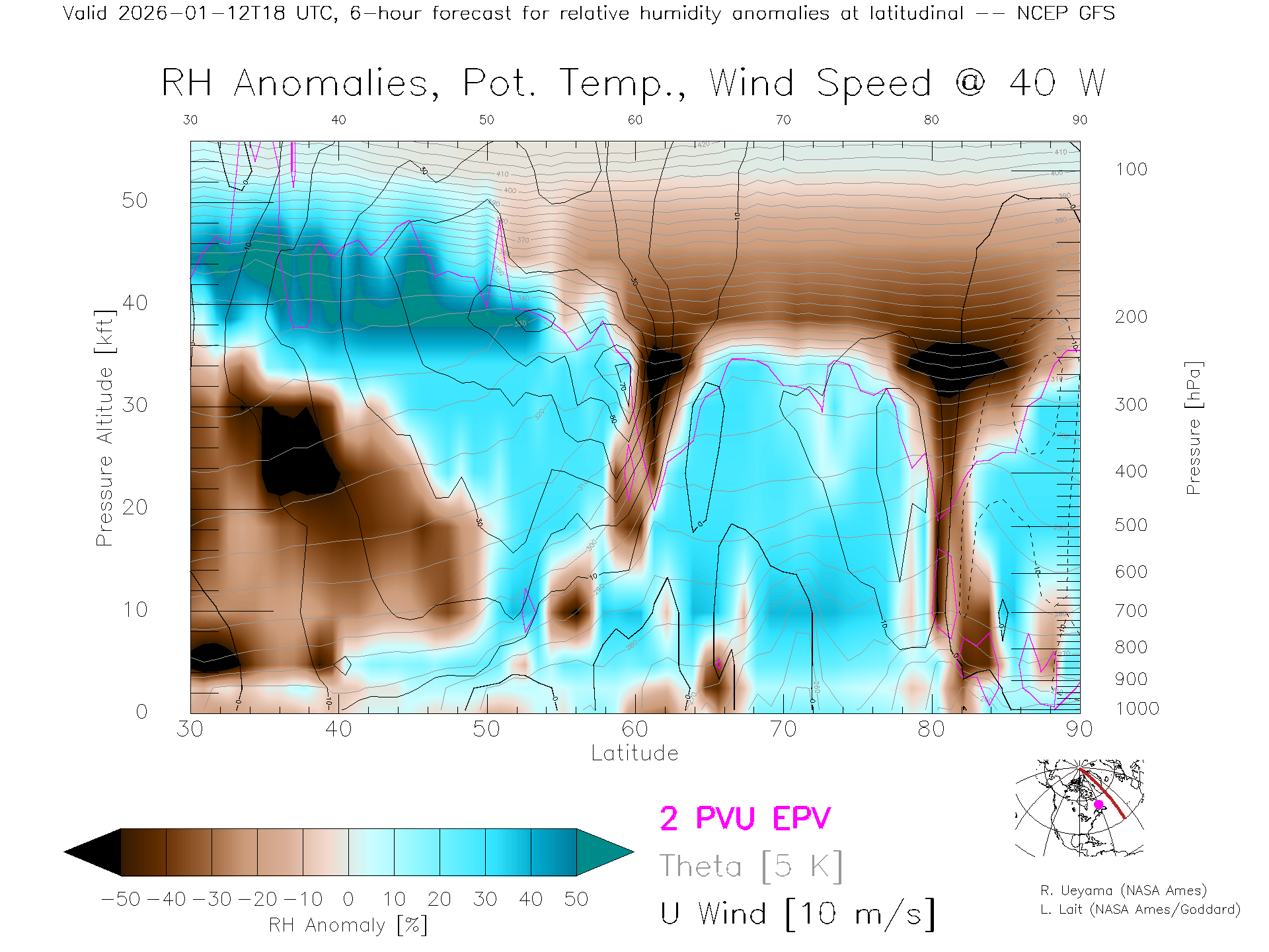 NCEP GFS Forecast Rel. Hum. X-Section (40 W)