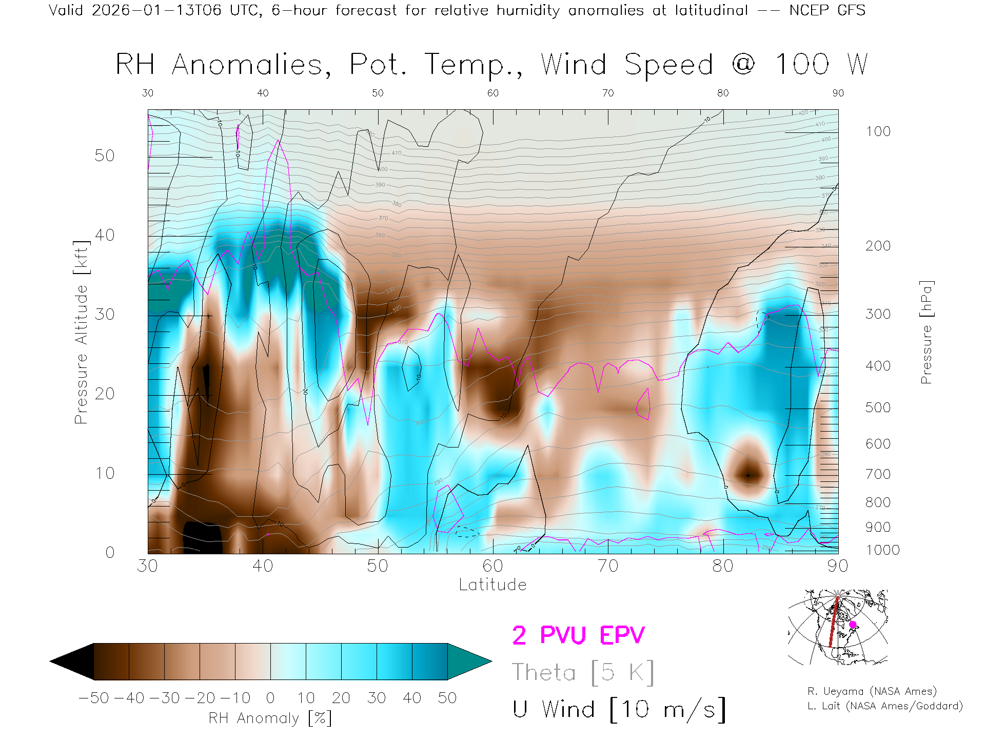 NCEP GFS Forecast Rel. Hum. X-Section (100 W)